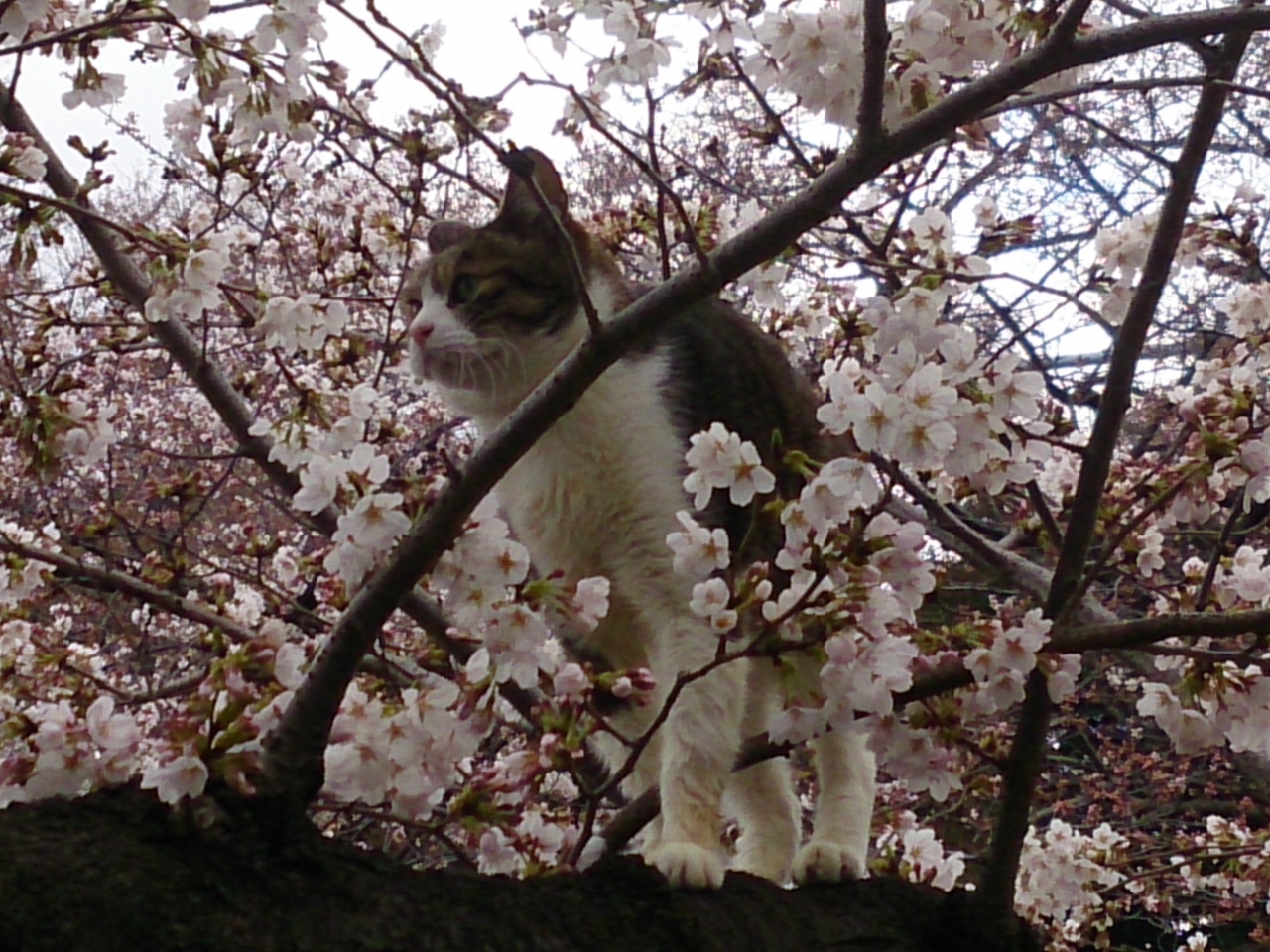 人だかりがあったので、見てみると猫が桜の枝に乗っていました。