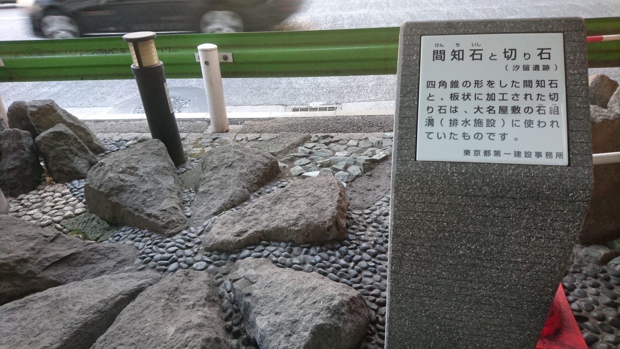 銀座7丁目の歩道橋下に汐留遺跡で発見されたものが置かれていました。中でも四角錘の形をした間知石と、板状に加工された切り石は、大名屋敷の石組溝(排水施設)に使われていたものだそうですが、見るだけでは使用方法が想像できませんでした。歴史的な価値が分からず残念でした。