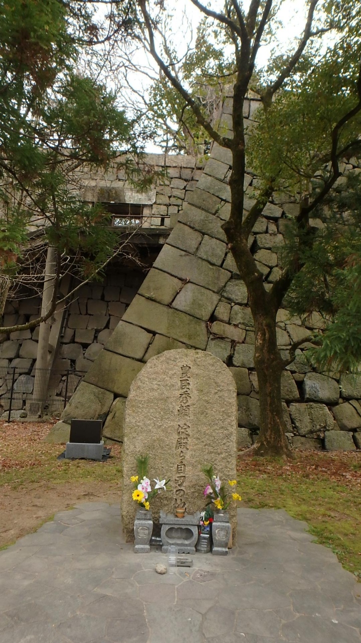 刻印石広場の反対側(西側)には祠のようなものが見えており、こちらは「淀君並殉死者三十二名忠霊塔」だそうです。自刃の碑は1997年、忠霊塔は1978年(但し別に、もっと古い台座もあり)に建てられたとのことで、いずれも比較的新しい。