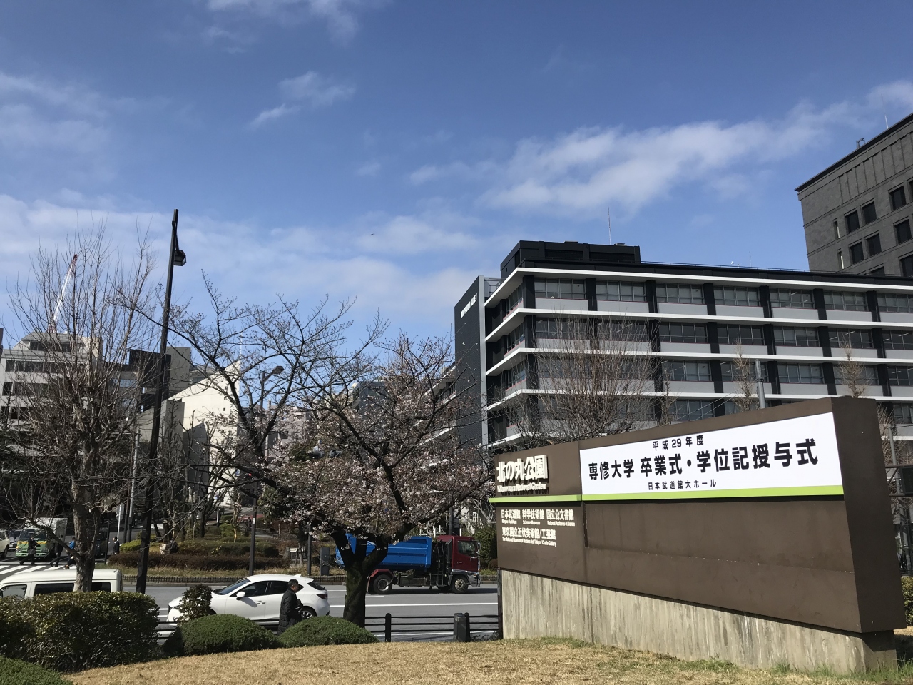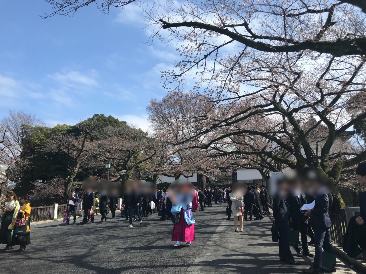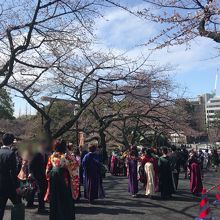 皇居北の丸公園側から袴やスーツ姿の若者たちが