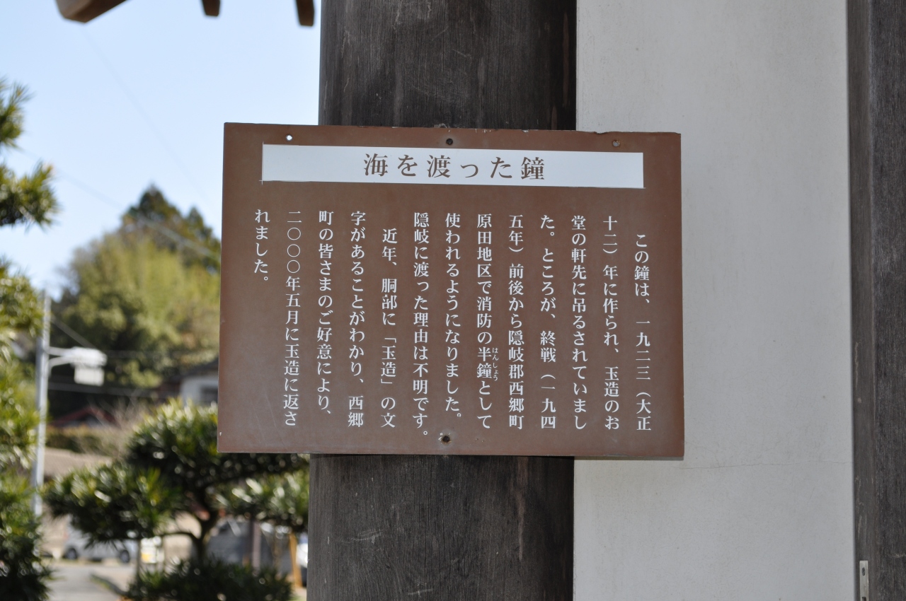 玉造温泉の玉作湯神社近くの交差点そばにありました。小さなお堂であまり見ごたえはなかったのですが、湯薬師堂には面白い鐘がありました。「海を渡った鐘」と呼ばれる鐘は1923年に作られ、玉造のお堂の軒先にあったそうですが、終戦前後から隠岐に移っていたそうです。その理由などはわかりませんでしたが、近年になって、胴部に「玉造」の文字が彫られてたことから2000年になって、湯薬師堂に戻されたそうです。なかなか面白い歴史があって楽しめました。