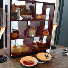 漆塗りの和モダンテイストなティースタンドで出されます。