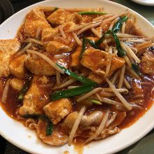 豆腐を揚げてもやし、ニラ、人参とバラ肉を炒めて出す珍しい麻婆豆腐