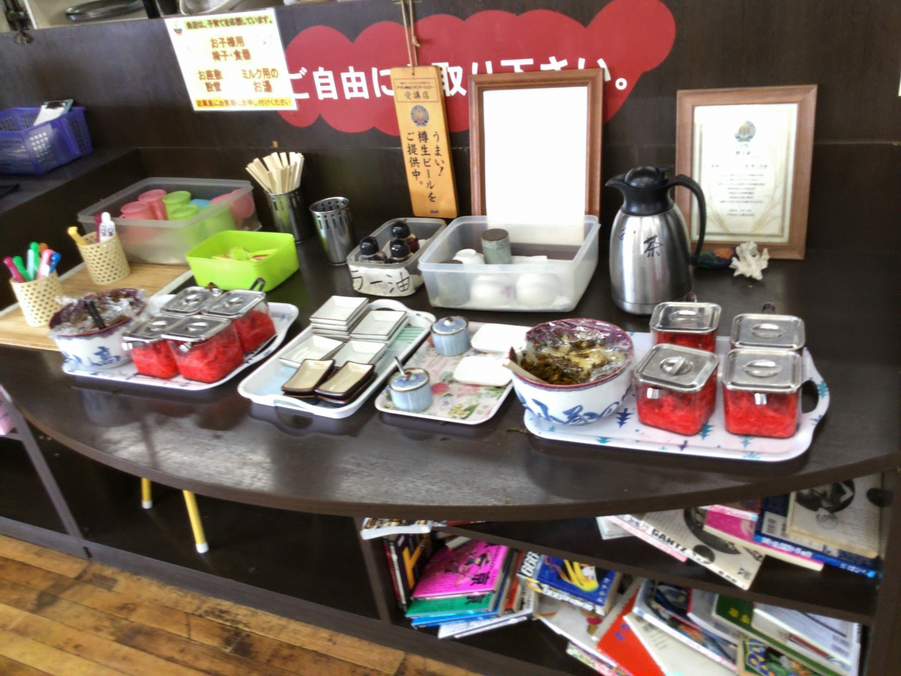 昭和(むかし)ラーメンが人気があるようです。いつもは味噌ラーメンを食べるのですが今日はしおとんこつラーメンをいただきました。結構いけるようです。からし高菜、紅ショウガが置いてあるので自由に取っていいです。
