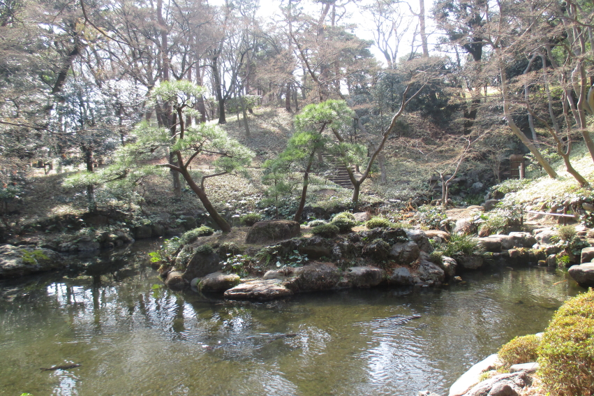 この殿ヶ谷戸庭園は、はけの斜面を巧みに利用していますから、高低差がかなりあります。当然、最低地の次郎弁天池まで行くにはかなりの急階段の道ですが、何筋もある道の内、1番外側には比較的緩やかな階段の道も造られています。それでも、ある程度は足元がしっかりしていないと行けませんが、財界で活躍する人は足もしっかりしていたのでしょうね。