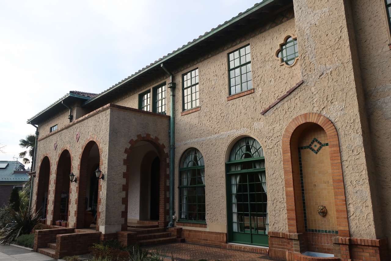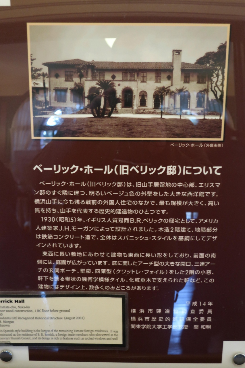 横浜山手の元町公園の隣にある山手外国人住宅の中で最大の建物です。スパニッシュスタイルの2階建て洋館はとても広く、サンルーム付きのホール、暖炉のある食堂、2階にある各寝室やバスルーム、どの部屋をとっても特色のある装飾が施され、映画に出てきそうです。昭和5年に建てられた洋館ですが、今でも十分に生活できるのではないでしょうか。