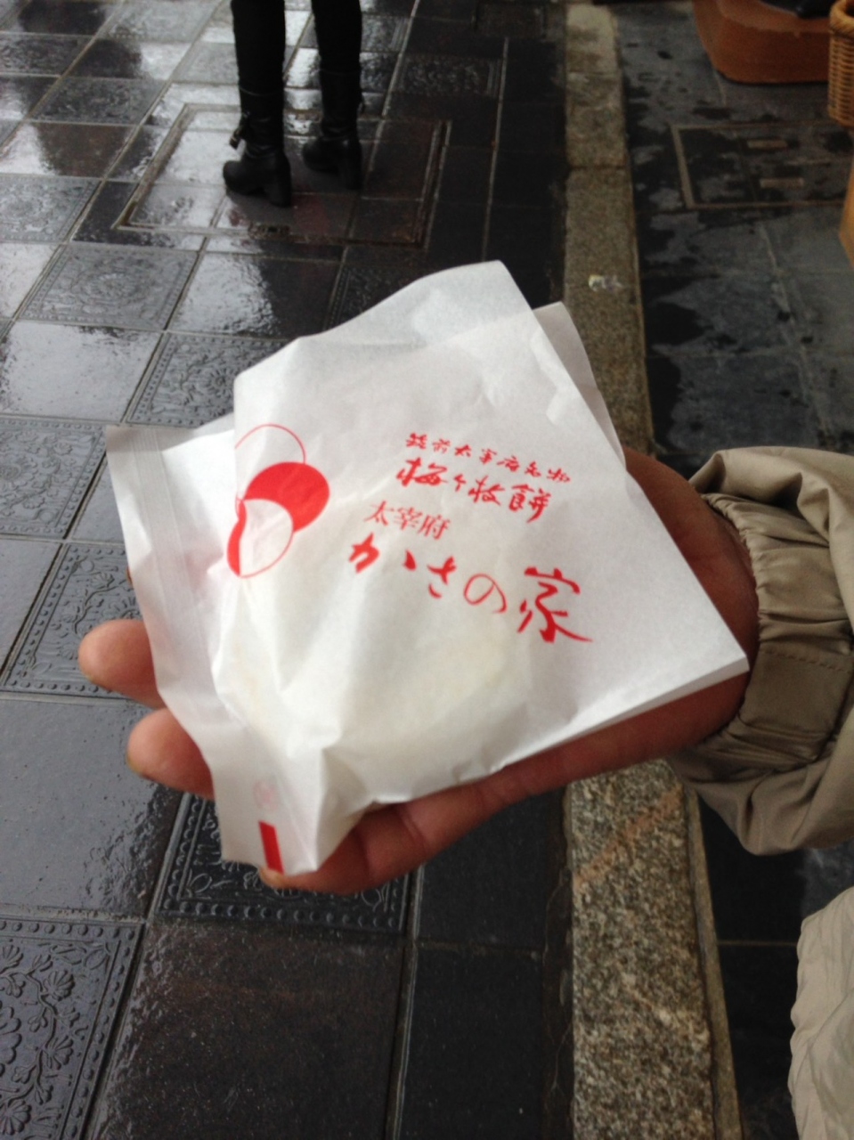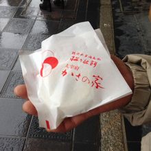 太宰府天満宮を散策しているとあちこちにありました。ガイドさんのおススメでこちらで並んで購入。そのまま渡してもらえました。お持ち帰りの方はビニール袋に入れてもらえました。お餅の食感というより皮がパリパリししてもちもち感は少ないです。餡は美味しかったです。