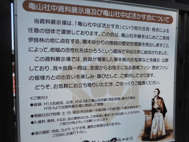長崎の龍馬の道を上って亀山社中へ、さらに上って若宮稲荷神社方面にいくと、こちらの展示館がありました。入館料金は無料でしたが、ちょっと入りにくい雰囲気で悩みました。中では写真とか竜馬や幕末関係のものがたくさん並んでいました。お土産とかも扱っていましたよ。