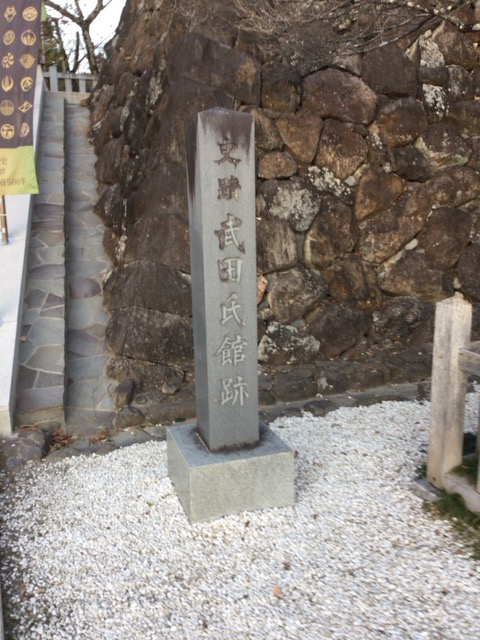 甲府駅北側の武田神社の入口近くにこちらの石碑が立っている。平日午後、境内に数人がいたが石碑周辺は静かであった。お勧めの点は、武田氏館は甲斐守護であった武田氏の本拠である甲府に築かれた城館で、守護所が所在していたこと、永正16年(1519)武田信虎が築き信虎、信玄、勝頼がその本拠としていたこと、城域は1.4万坪と大変広く外濠、内濠、空濠に囲まれた三重構造になっていたこと、現在、この跡地に武田神社があること、石碑と説明板を見ながら武田の武士達がこの付近を行き来していたことを楽しく想像できること、当時の武田氏の勢力が大変大きかったことを理解できることである。
