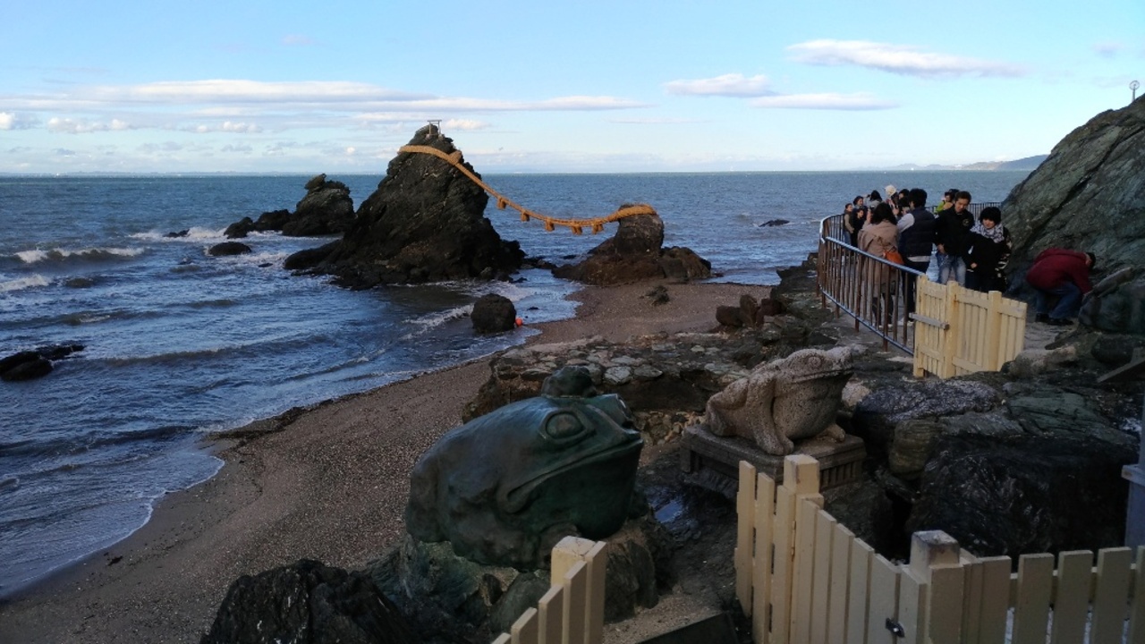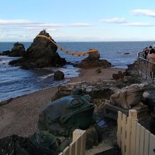 初めて見て、思ったより近くにあることを知りました。写真やTVなどの印象では、もっと沖合にあるものと思いこんでいましたが、すぐ目の前にあり、干潮時だったので夫婦岩まで地続きになっていました。