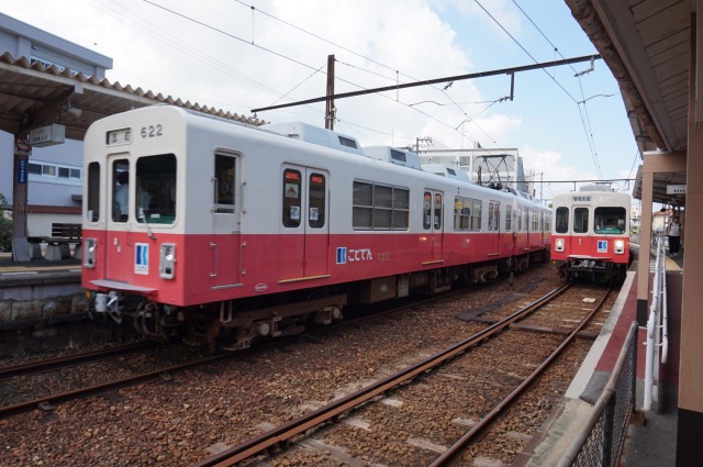 ことでん3路線の一つ。ラインカラーはピンク?っぽい赤色で、昔の「コトデン」時代の塗装に近いです。