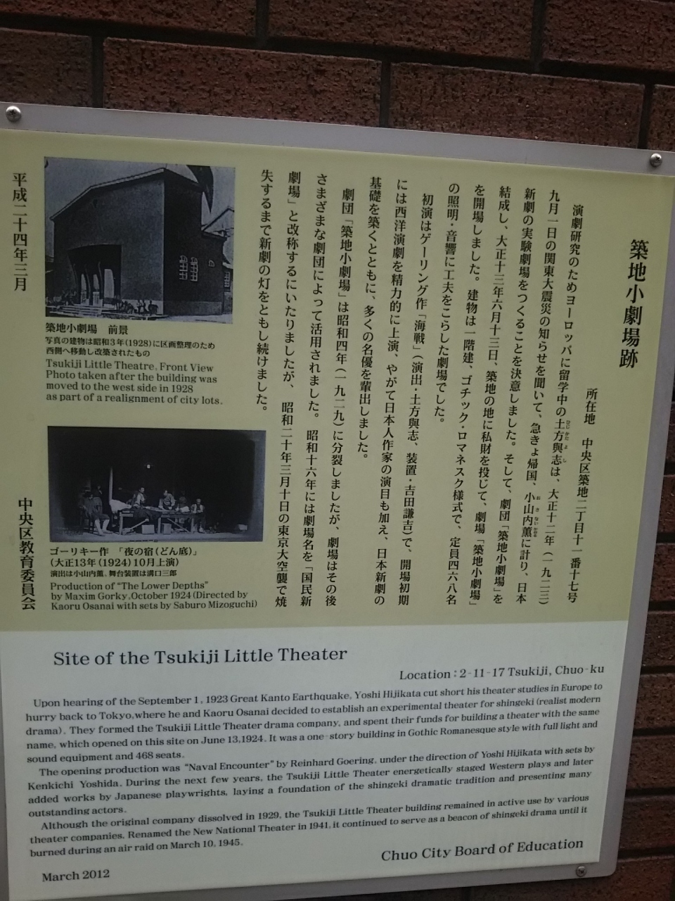 日本の演劇の先駆けとなる拠点の場所がこちらにあったそうです 特に明治の時代に入り後の築地のエリアでは医学や海軍の軍事的な研究、演劇や絵画など幅広いことが発展しました その中でも演劇はこちらの場所から発展し、様々な劇団によって使われたそうですが東京大空襲で亡くなったそうです