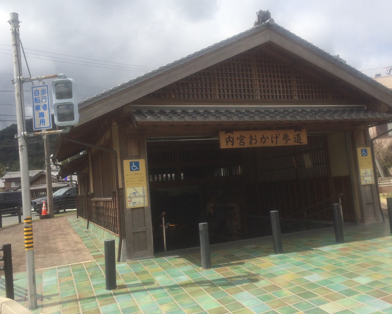 国道23号線からそれると和風的な屋根があり地下道になっていて階段を降りると、地下道には左右に江戸時代の京都三条大橋から外宮内宮、二見までの絵が描かれていました。お伊勢参りのことがよくわかる絵図でした。