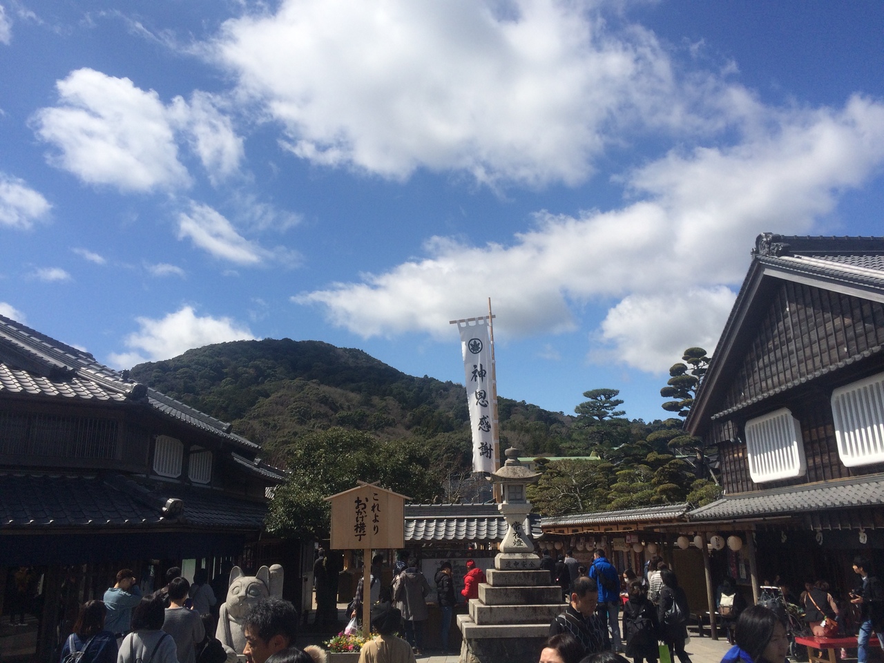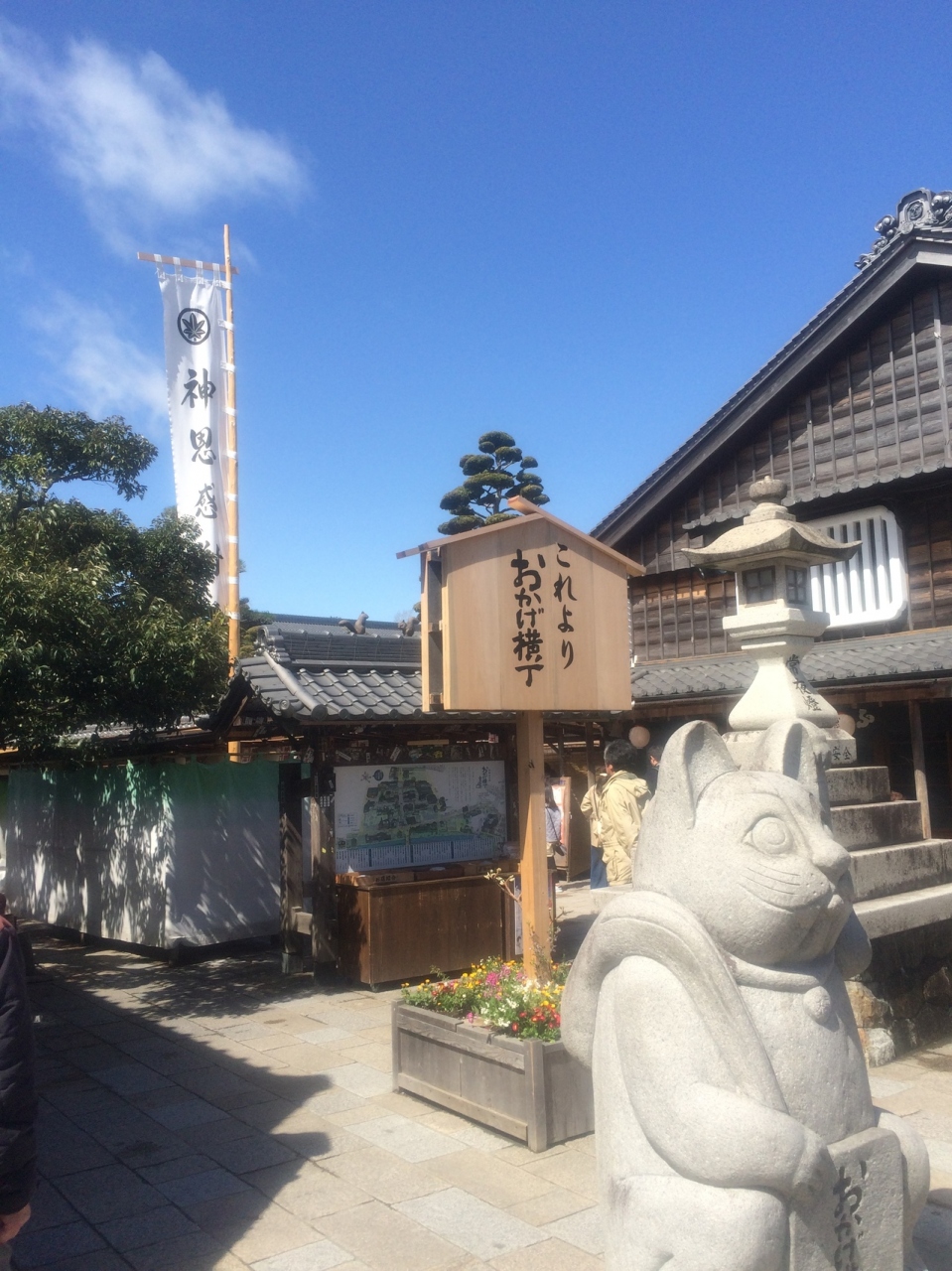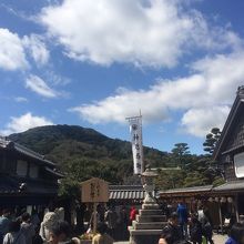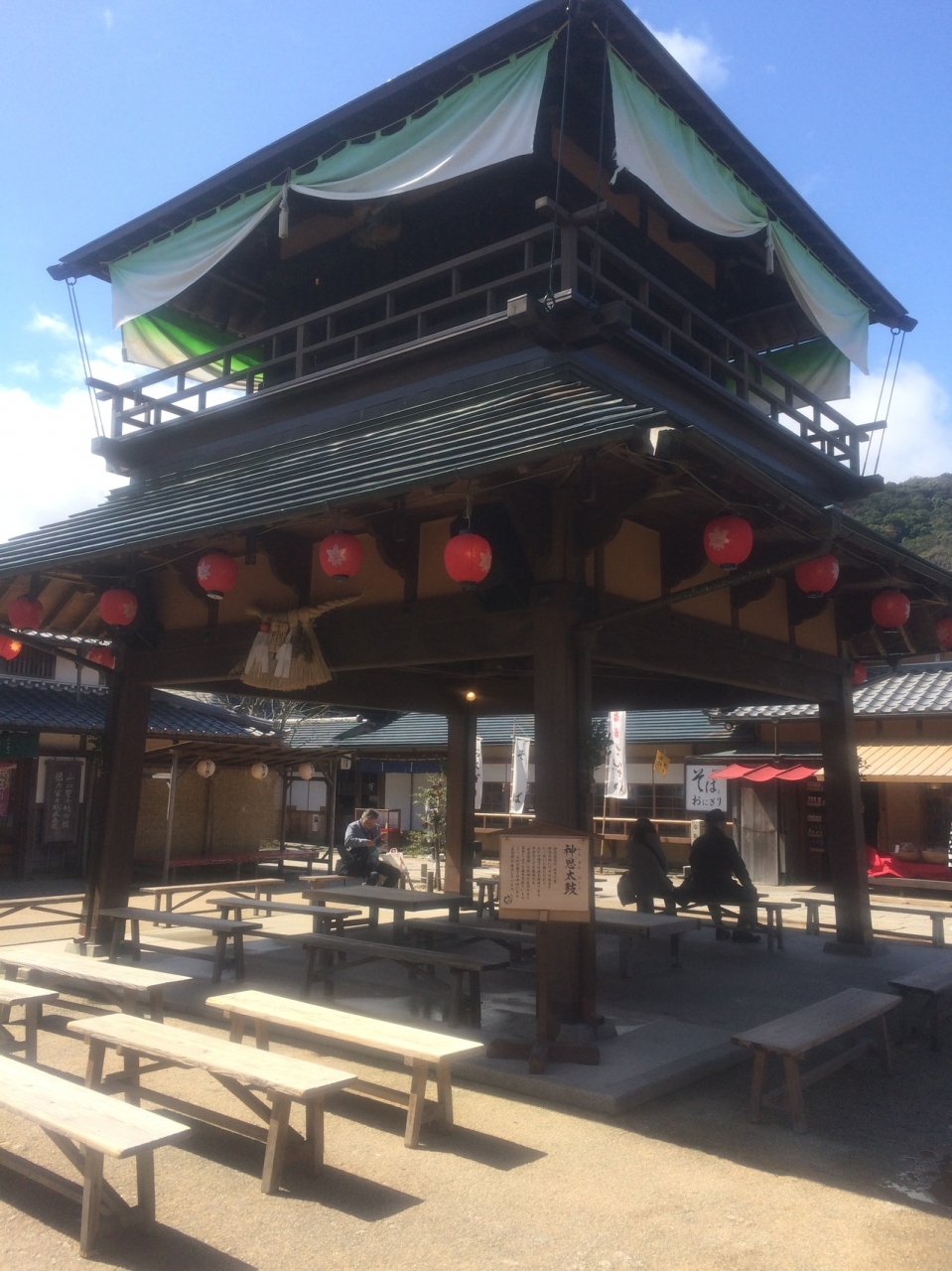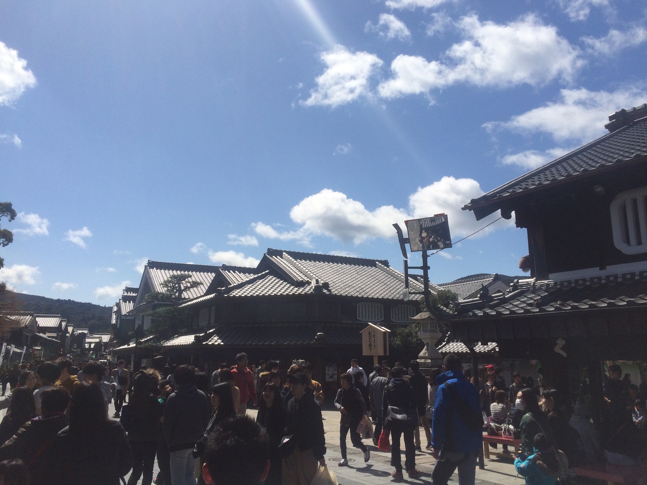 江戸時代のおかげ参りを再現した町だけあって江戸時代ぽい建物がある多く時代劇には出てきそうな建物ばかりの店構えでした。太鼓櫓を中心に四方に道が伸びていて雑賀屋、食べ物屋が並んでいました。おはらい町通り沿いにあるエリアです。