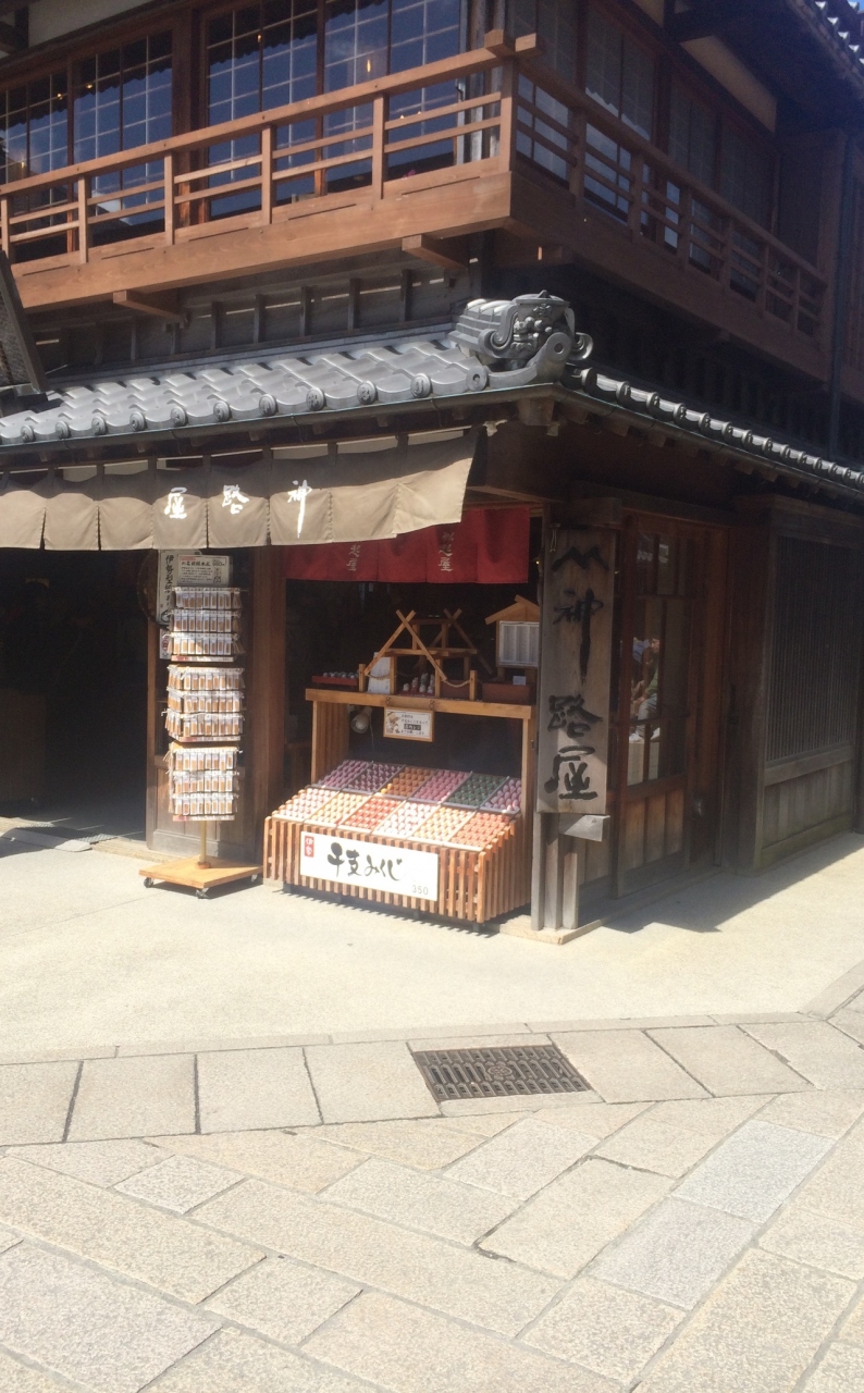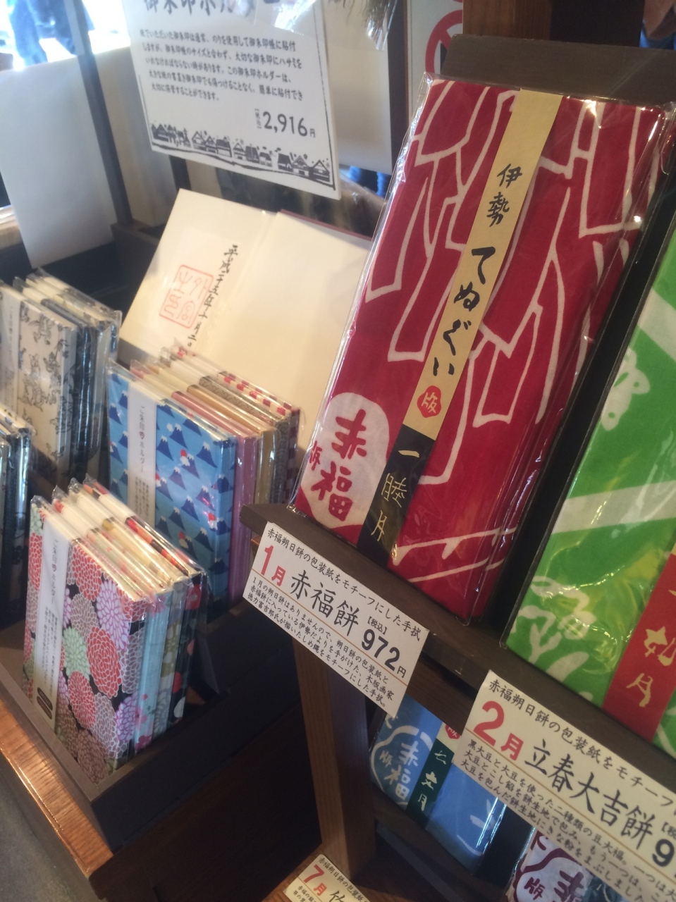 手ぬぐい、 箸、お洒落なハガキ等、縁起物を販売してる店で2階にも店があるあります。特に箸の種類が豊富でどれを購入しようか迷いました。店頭には伊勢みくじが置いてあり、自分で引いてレジ支払いです。店内はびっしりと土産が置いてありました。