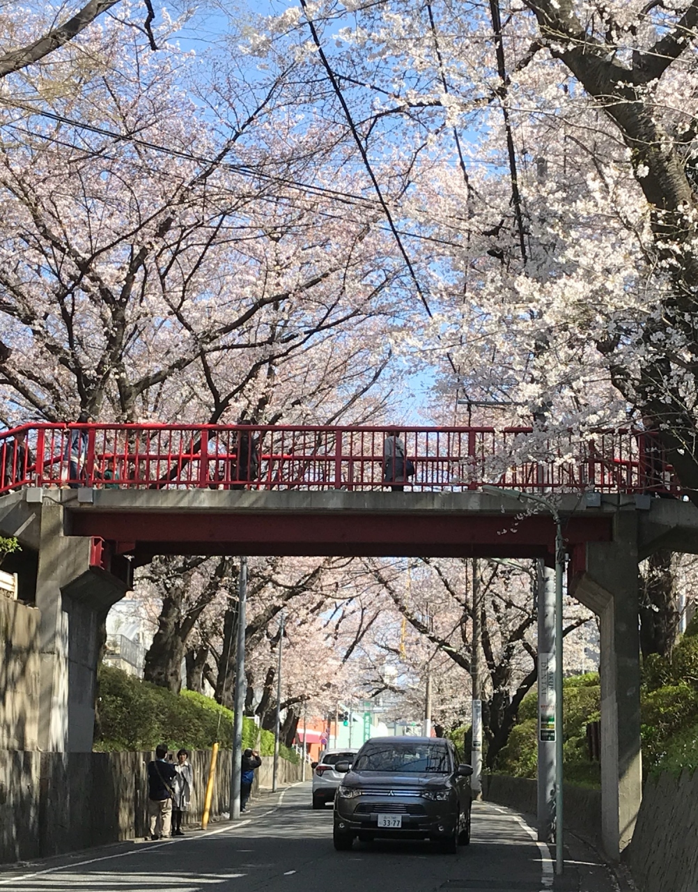 桜坂の中ほどには、人が行き来するための赤い橋がかかっていて、絶えず人の姿がありました。