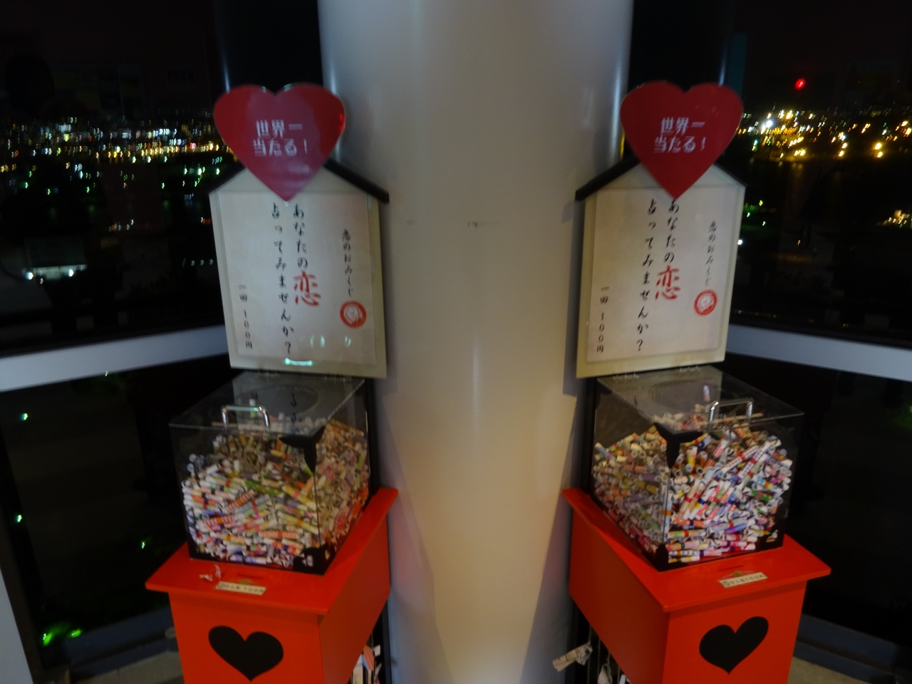 1階にチーバくんグッズが売っている売店があるので行ってみました(が、19時で売店が閉店だったため買えなかった)。タワーはエレベーターで昇りますがエレベーターの中は特別景観が綺麗でもなくタワーの骨組みが見えるだけです。高いタワーではありませんが周りの景色が低いので夜景はそこそこ綺麗に見ることができます。私にとってはホッとできるスポットです。一応恋人の聖地らしくそれっぽい備品(お神籤とか)があります。