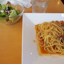 小倉城の目の前という好ロケーションもあってか、とにかくお値段お高め。観光地料金です。渡り蟹のパスタをオーダー。おいしいが、カニがほとんど入っていないレベル。パスタ+サラダ+ワンドリンクで2200円ほど。高いランチになった。