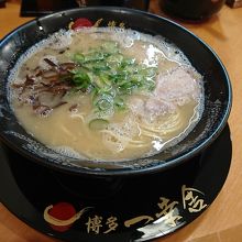 池袋駅東口から徒歩数分。路地にラーメン屋さんなど飲食店の集まる辺りにあります。細長いお店で、カウンター席の奥にテーブル席があり、入口には食券機があります。博多豚骨、赤、黒とある中で、一番ノーマルな博多豚骨をオーダー。黒い器でお皿付きはすこし大袈裟ですが、味はノーマルな豚骨ラーメンという印象。スープはカなり煮込んである感じで、豚骨の匂いが結構します。泡がスープをおおう感じになるのでなかなか冷めません。しかし、見た目ほどくどくない。麺は一般的な細麺で小麦の香りがするタイプ。具も、薄切りの豚肉、キクラゲ、ネギとシンプル。無料の白しょうがを入れたところ、味が締まって美味でした。ノーマルな豚骨ラーメンを食べたいときオススメ。