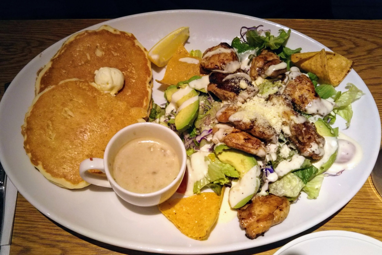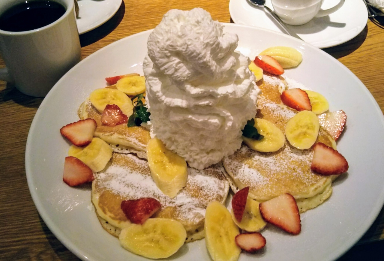 お食事系のパンケーキと、フルーツとホイップクリームたっぷりの甘いパンケーキを注文し、取り分けていただきました。