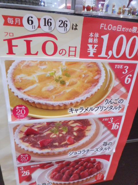 海老名駅からすぐの場所にあるマルイファミリーの中、1階の食品街にあるお店ですのでわかりやすい場所です。たまたま前をと通ったら、お店の前に「6のつく日はFLOの日」という看板が出ていて、お得なタルトがあったので購入しました。ラッキーでした。