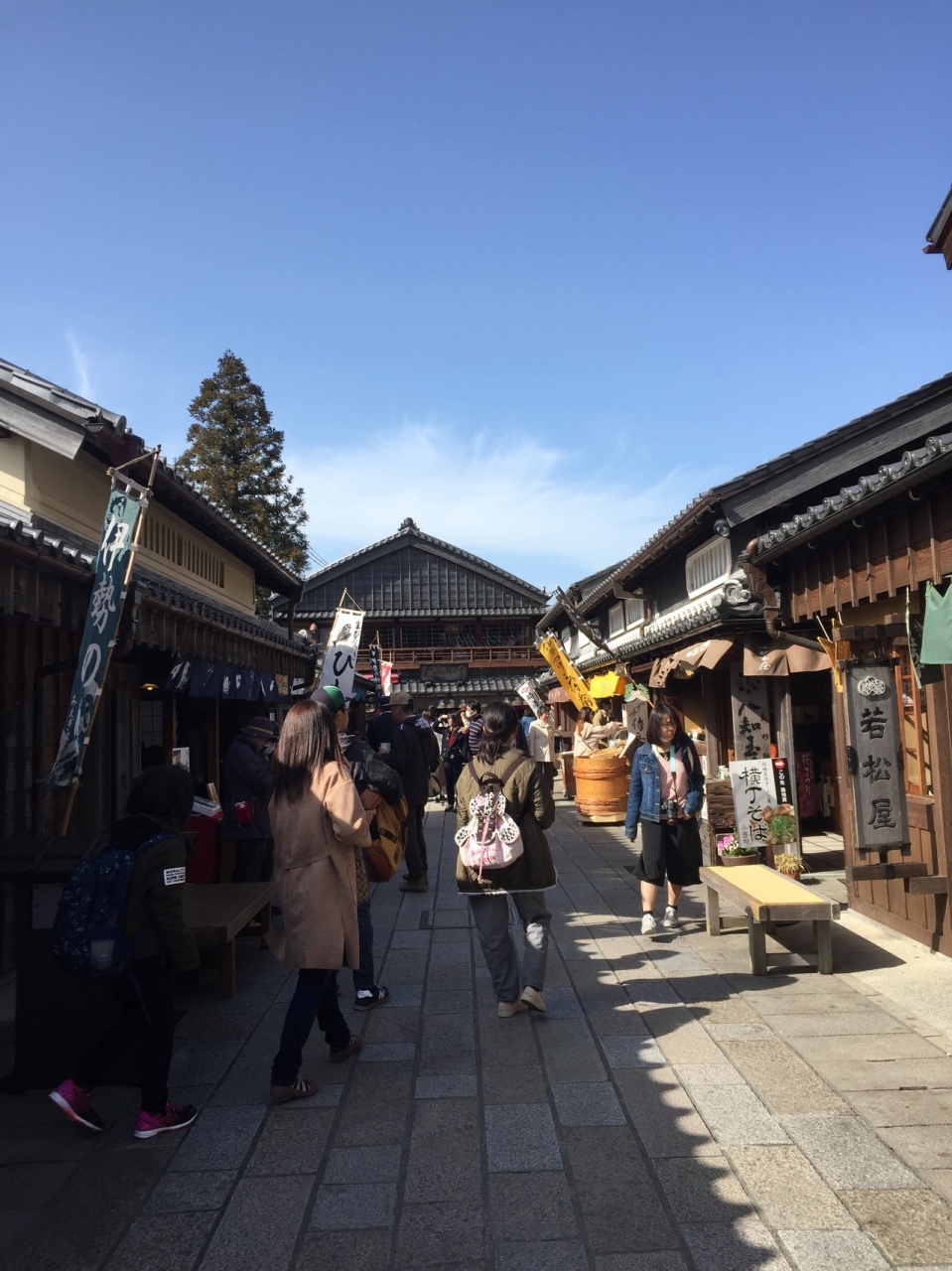春休み中とは言え平日でしたが、かなりの人で賑わっていました。たくさんのお土産屋さんや、食べ物屋さんなどがあって、楽しく散策できそうな街並みでした。昔の宿場町みたいな風情がありました。お店に入って食事するのも良いと思いますが、気になった物を食べ歩きするのもありかな!