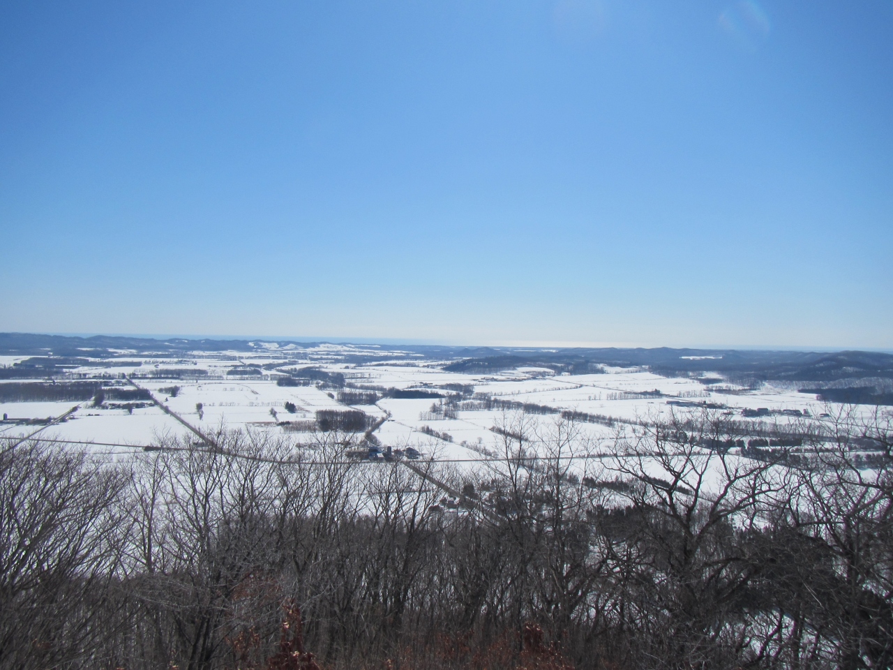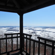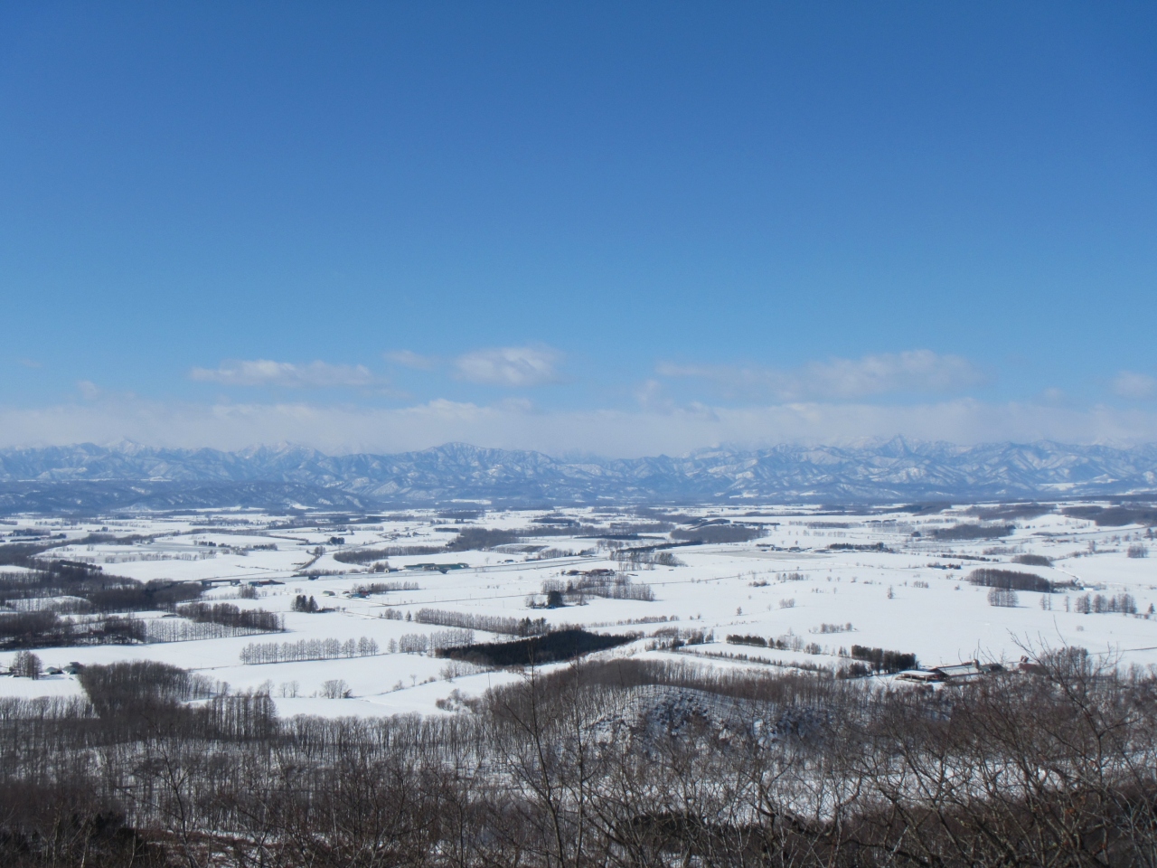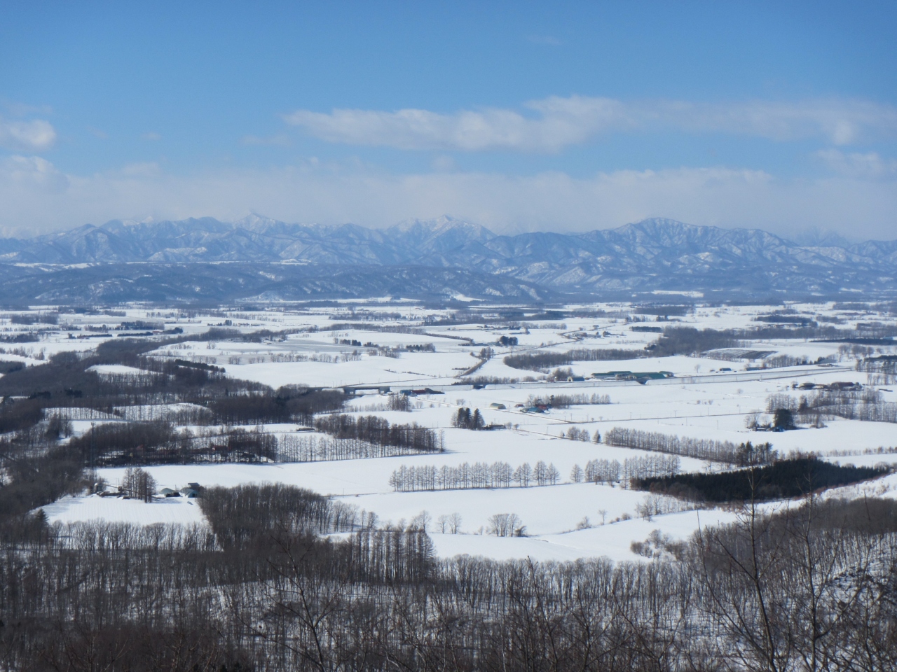 畑作地や木々の生えた丘の広がる十勝平野に、遠くには日高の山並みが北の方から屏風のようにえんえんと続く大パノラマが見られる展望台です。