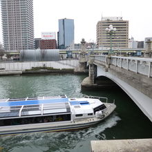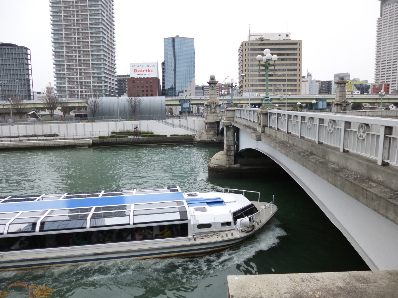 北浜駅から北に向かうとすぐに土佐堀川を渡ります。ライオン像でお馴染みの「なにわ橋」です。なにわ橋の下を水上バスが通るのが見られました。