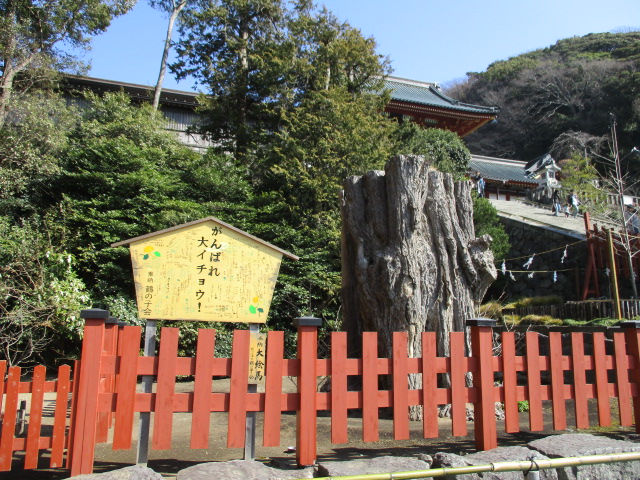 JR横須賀線鎌倉駅東口からホテル鎌倉の先の二の鳥居から一段高い歩道の段葛を真っ直ぐ進み鶴岡八幡宮三の鳥居をくぐり鶴岡八幡宮舞殿の先の本殿に向かう石段の左手にある大銀杏に歩いて10分ぐらいで着きます。大銀杏は徳川光圀の新編鎌倉志で3代将軍源実朝を暗殺した公暁が隠れていたという話が載せられ隠れ銀杏と呼ばれていたそうです。1000年以上も鎌倉の歴史を見守ってきた銀杏は平成22年3月10日に突然倒木し、残念ながら現在は切株しか残っていませんが、写真が掲示されてますので当時を偲びにお立ち寄りをお勧めします。がんばれ大イチョウの寄せ書きが奉納されていて震災を思い出しました。大銀杏の再生した黄葉を観たいです。