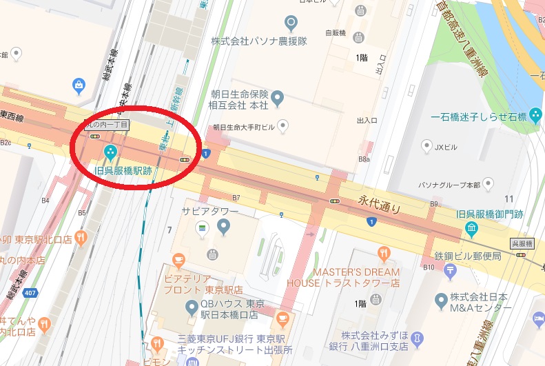 呉服橋の架道橋は、東京駅の北側にあり、永代通り上にあります。