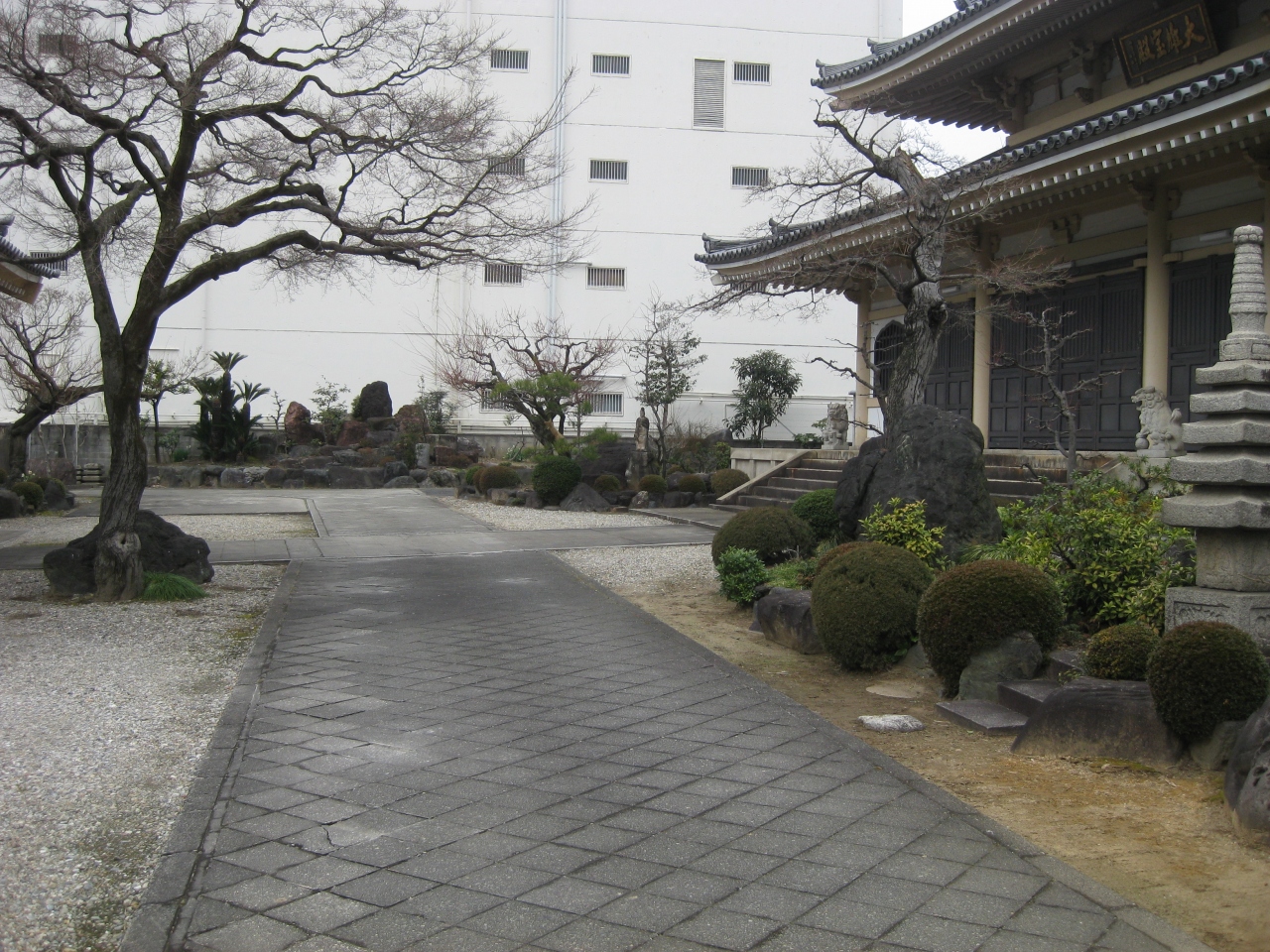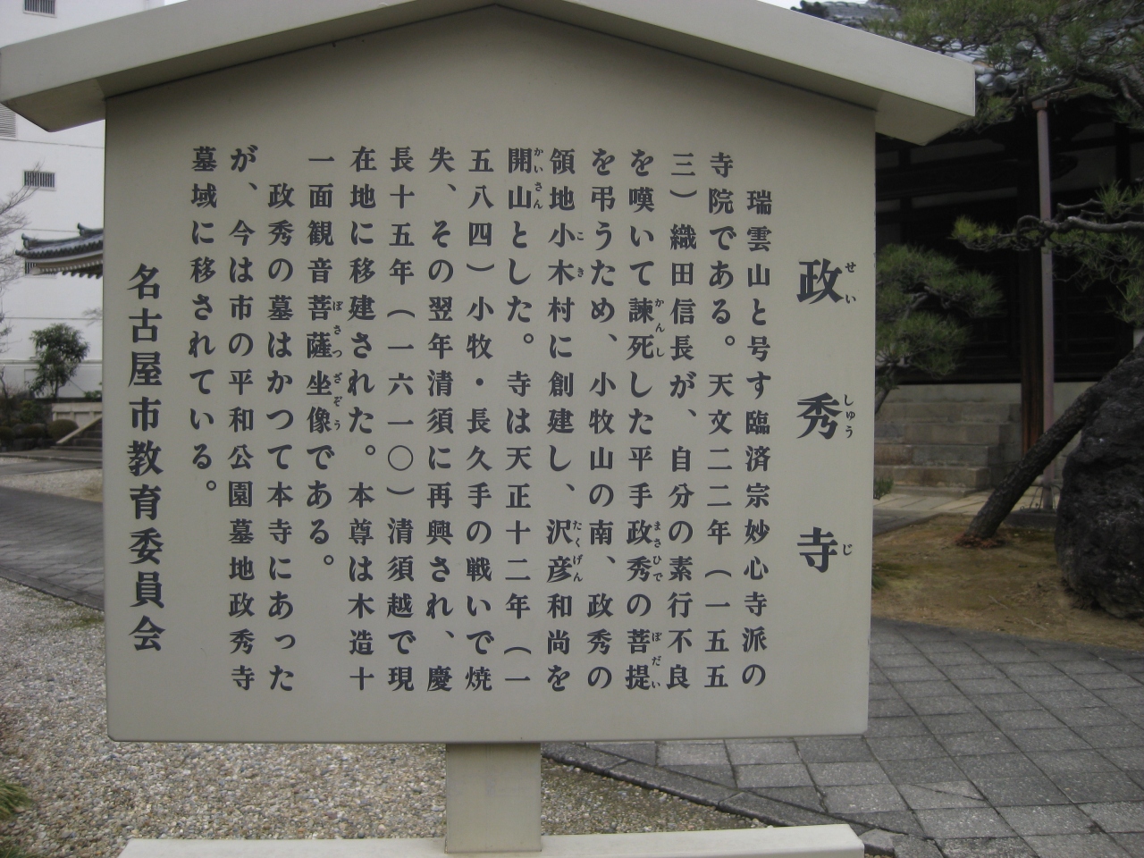 有名な100m道路の若宮大通りの北側に面して建つ臨済宗妙心寺派寺院。天文22年(1553年)に織田信長が家臣平手政秀を弔うために小牧山の南に創建したのが始まりで清州城下へ移転、その後名古屋城築城による”清州越し”で当地へ移転し今に至ります。山門が見事で境内も広く本堂も立派、見ごたえあります。入山料は無料です。当寺の西隣に若宮八幡社が鎮座しています。