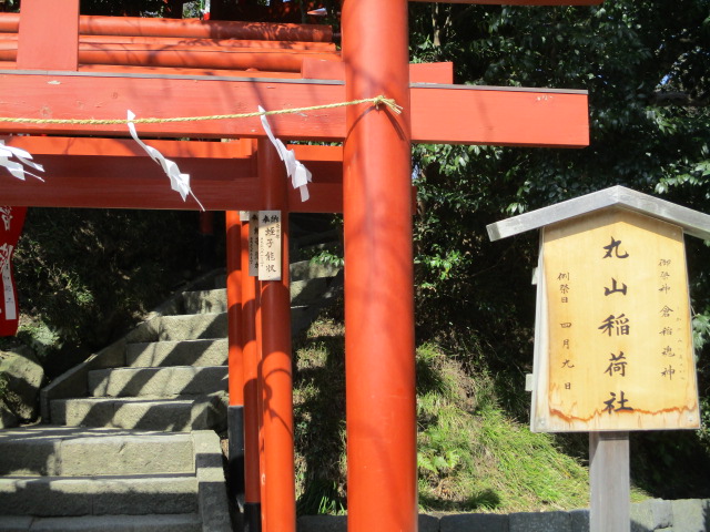 JR横須賀線鎌倉駅東口からホテル鎌倉の先の二の鳥居から一段高い歩道の段葛を真っ直ぐ進み鶴岡八幡宮三の鳥居をくぐり鶴岡八幡宮本宮の左側の小高い丘の上にある丸山稲荷社に歩いて10分ぐらいで着きます。丸山稲荷社の社殿は鶴岡八幡宮境内にある最も古い建造物(室町中期)で大臣山に祀られていたが鶴岡八幡宮造営の際に現地へ遷されたそうです。観光客は少ないですが赤い鳥居が連なっていて狛狐様も鎮座してとても静かに参拝ますので鶴岡八幡宮参拝の際は足を延ばしてお立ち寄りをお勧めします。赤い鳥居に蛭子能収の名がありました。
