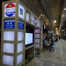 アーケード内のバス停は、木で作られていてユニーク。林業県らしく、宮崎県産の杉材を活用して作られています。こんなバス停あるといいな~コンテストなるコンペの、入賞作なんだそうです。
