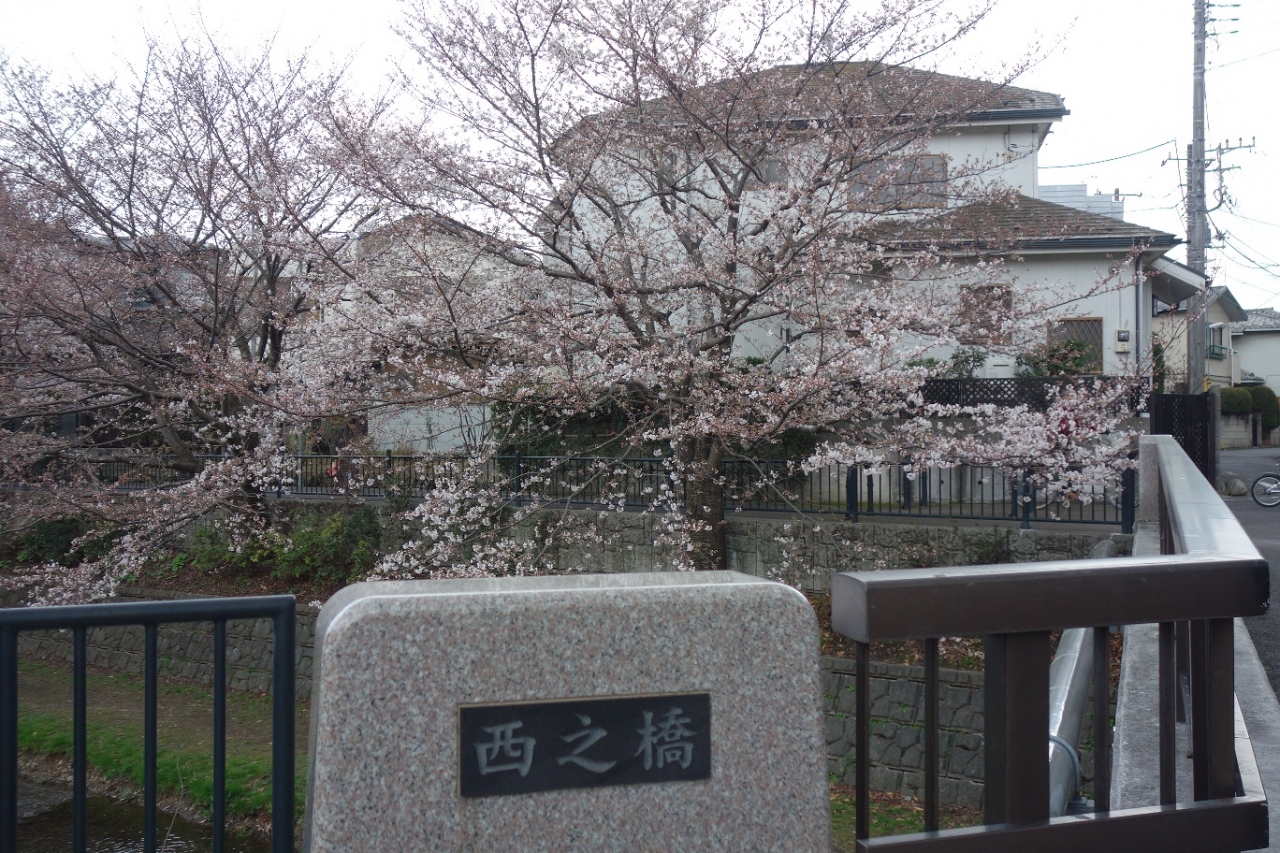 野川に架かる橋のひとつです。まわりは住宅地になっていますが川沿いには桜並木が有って訪れた時は桜が3~5部咲きになっていました。満開まではもうひと息でしたが橋から見る川沿いの桜並木はとても美しかったです。