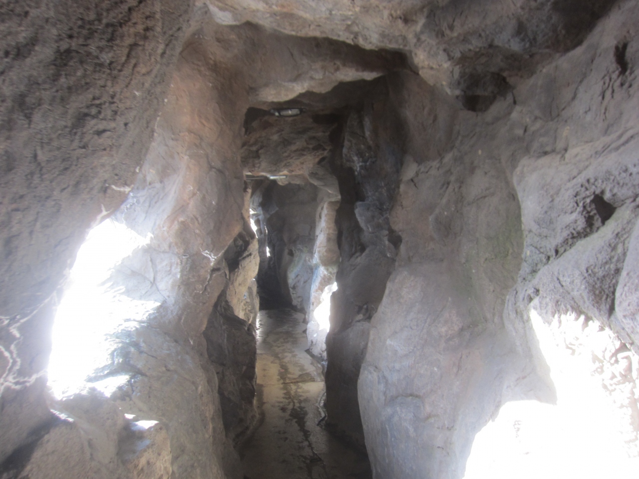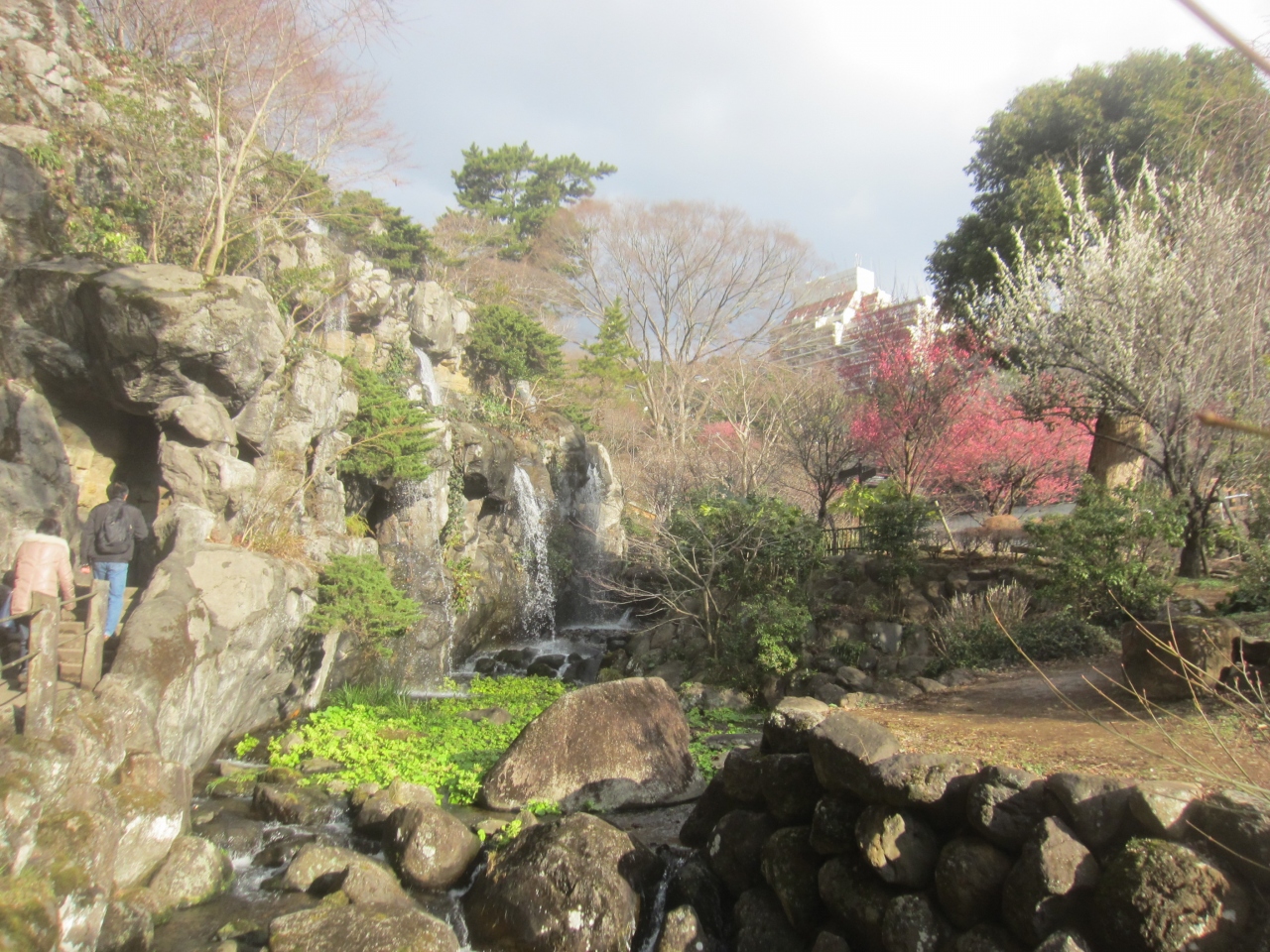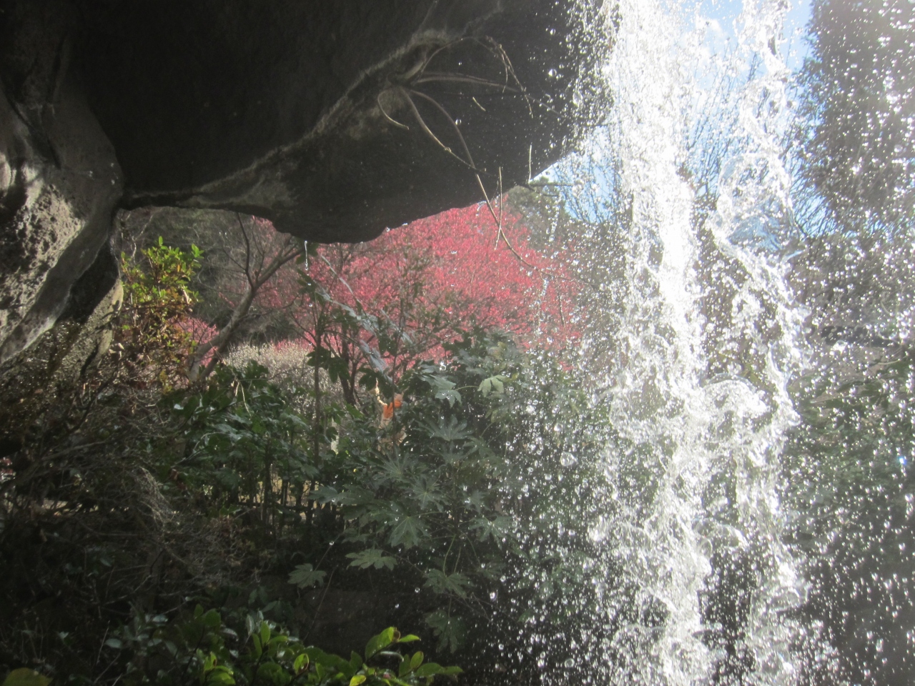 熱海梅園に入って奥へと進んで行くと左の方に滝があります。洞窟のようになっている岩に空いた通路を進んで行くと、滝の裏側へ。ここから滝越しに梅を鑑賞することもできます。ただし、通路は狭いので、あまり立ち止まって梅を見ていると中は渋滞して他のお客さんに迷惑です。滝の裏は結構水たまりがあるので、濡れないように注意!です。