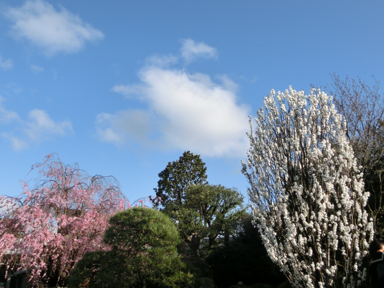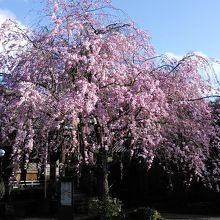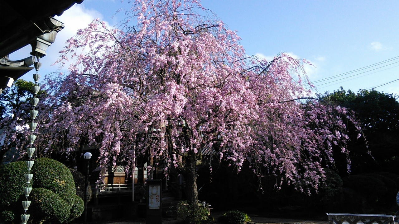 谷中霊園を北へ歩いていくと、突き当りがお寺になっていて、大仏の姿が見えたので入ってみました。中に入ると、本堂の脇に枝垂桜が美しく咲き誇っており、記念撮影する人がたくさんいました。庭はきれいに手入れされ、季節の花が楽しめる日本庭園のようです。