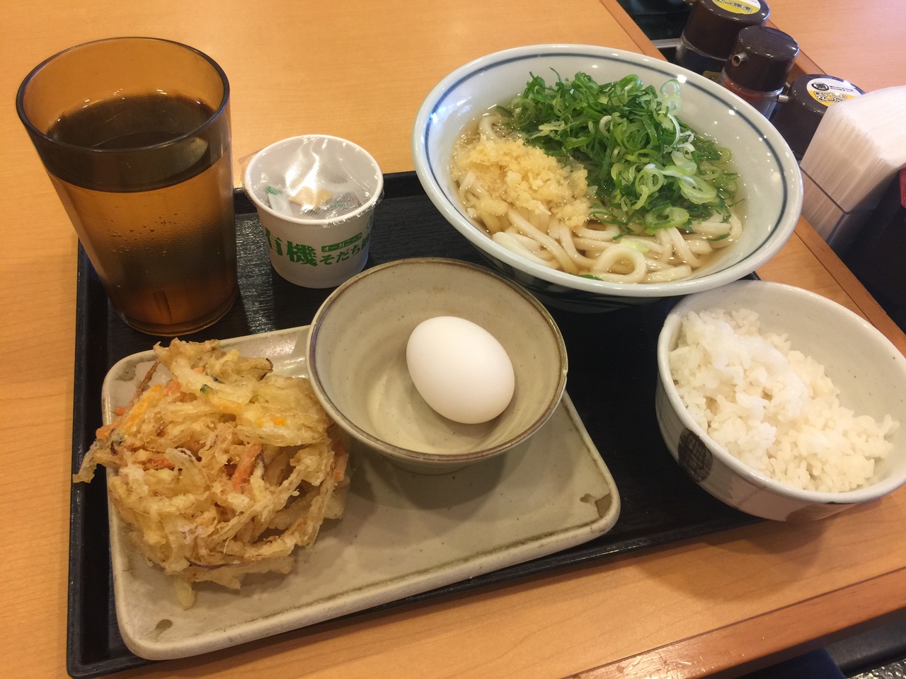 食べたのは納豆朝食!ご飯に納豆と生卵、小うどんとかき揚げ天ぷらで350円です。小うどんを普通サイズに100円でしてもらいました。ナイスバランスです(^ ^)