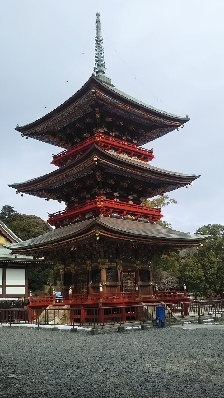 成田山へ参拝に行き、石段を登って本堂に着くと、その前の右側にあります。全体的に色鮮やかな赤や金が目立ちますが、これは何度か修復したためのようです。柵があって中には入れませんが、一週回ってみると細かい造作に宮大工さんの技術を感じます。