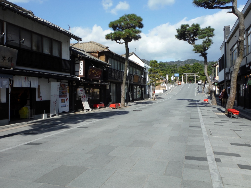 出雲大社の正門の鳥居から宇迦橋の大鳥居までの約500メートル続く神門通り。道幅も広く、松の並木が続き雑貨店や飲食店などがあります。古民家カフェやぜんざいの店もあるので休憩にもぴったり。観光案内所もあるので観光にははずせない通りです。