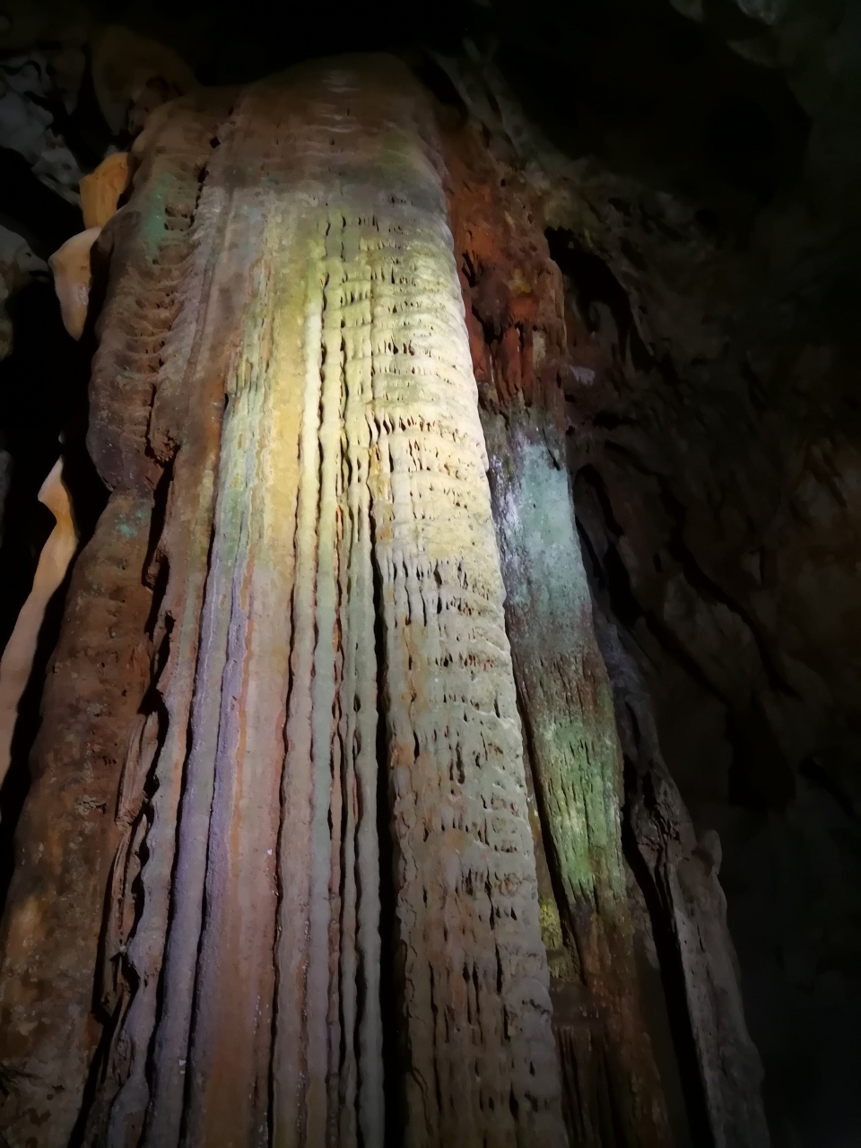 日本の三大鍾乳洞の一つの秋芳洞に有る黄金柱は、名前の通り凄い規模と存在感と美しさを兼ね備えた石灰の柱です。長い年月をかけて出来た柱は色々な歴史の目撃者ですね。静かに私たちを迎えてくれて、ボタンを押すと解説が流れます。
