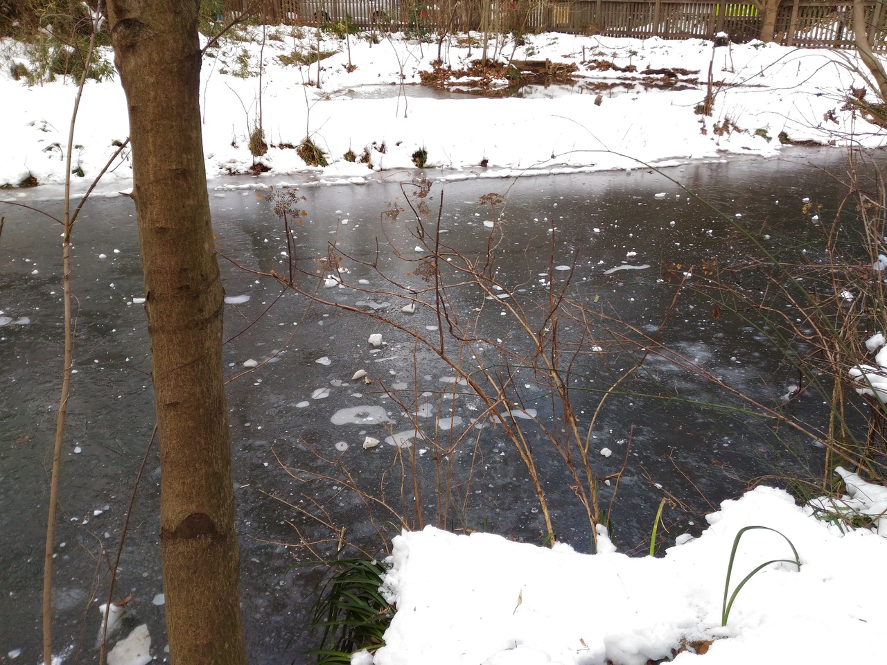 大雪のあと、しばらくしてから行きましたが、生田緑地はまだまだ雪だらけでした。池は凍り、つららができ、屋外に設置されたトイレは凍結で使用不可に。思いがけない雪国体験ができました。