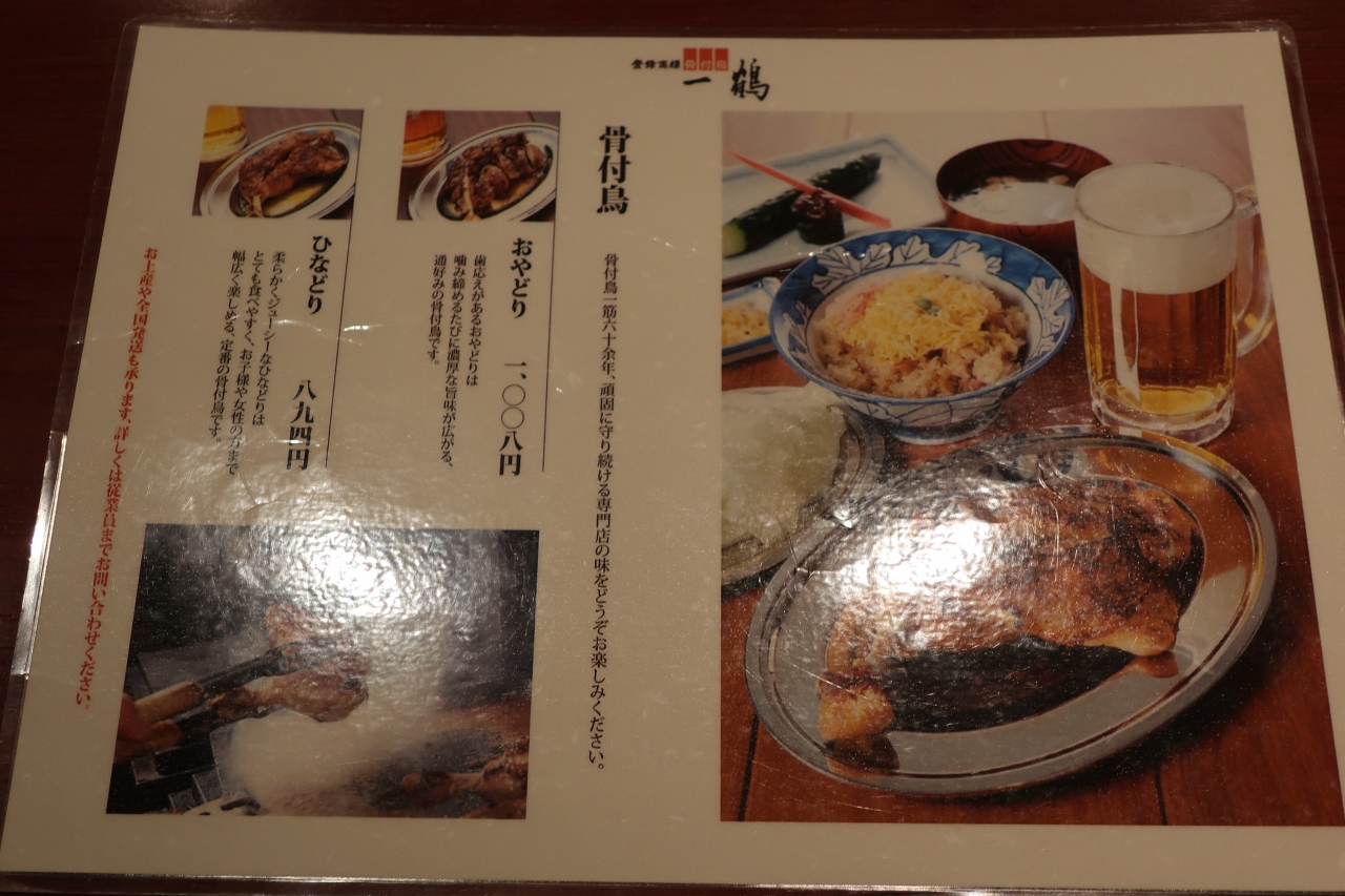 骨付き鳥は親鳥とひな鳥の二種あり、香ばしい味付けで焼き上げた骨付鳥をかぶりついて、豪快に食べるのがこの店のスタイル。兎も角ビールに良く合います。
