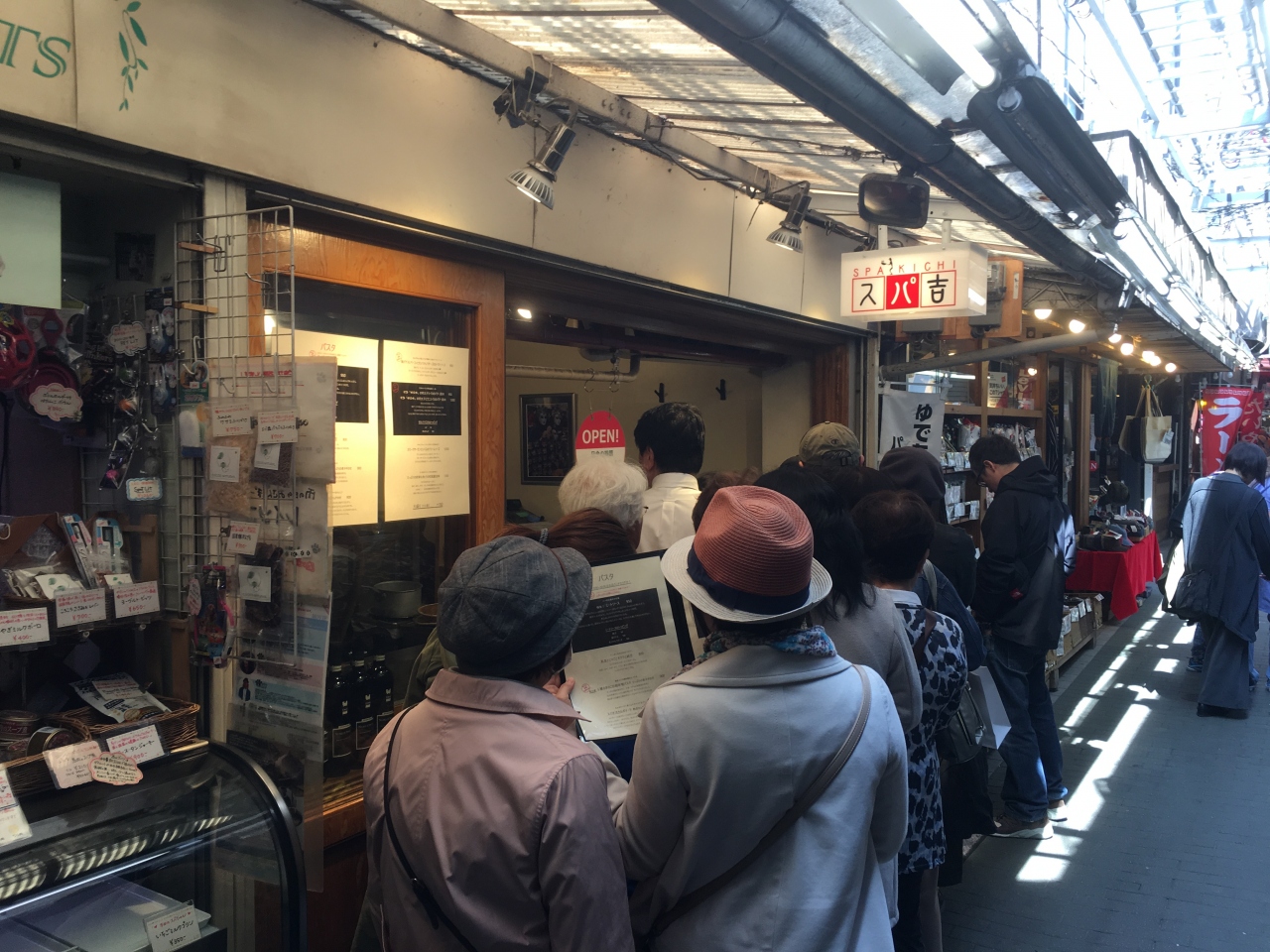 昼間はさとうのメンチ・小ざさの羊羹&最中・塚田の吉祥寺あげの行列に驚きながら路地に入ればスパ王などの行列に驚くことでしょう。