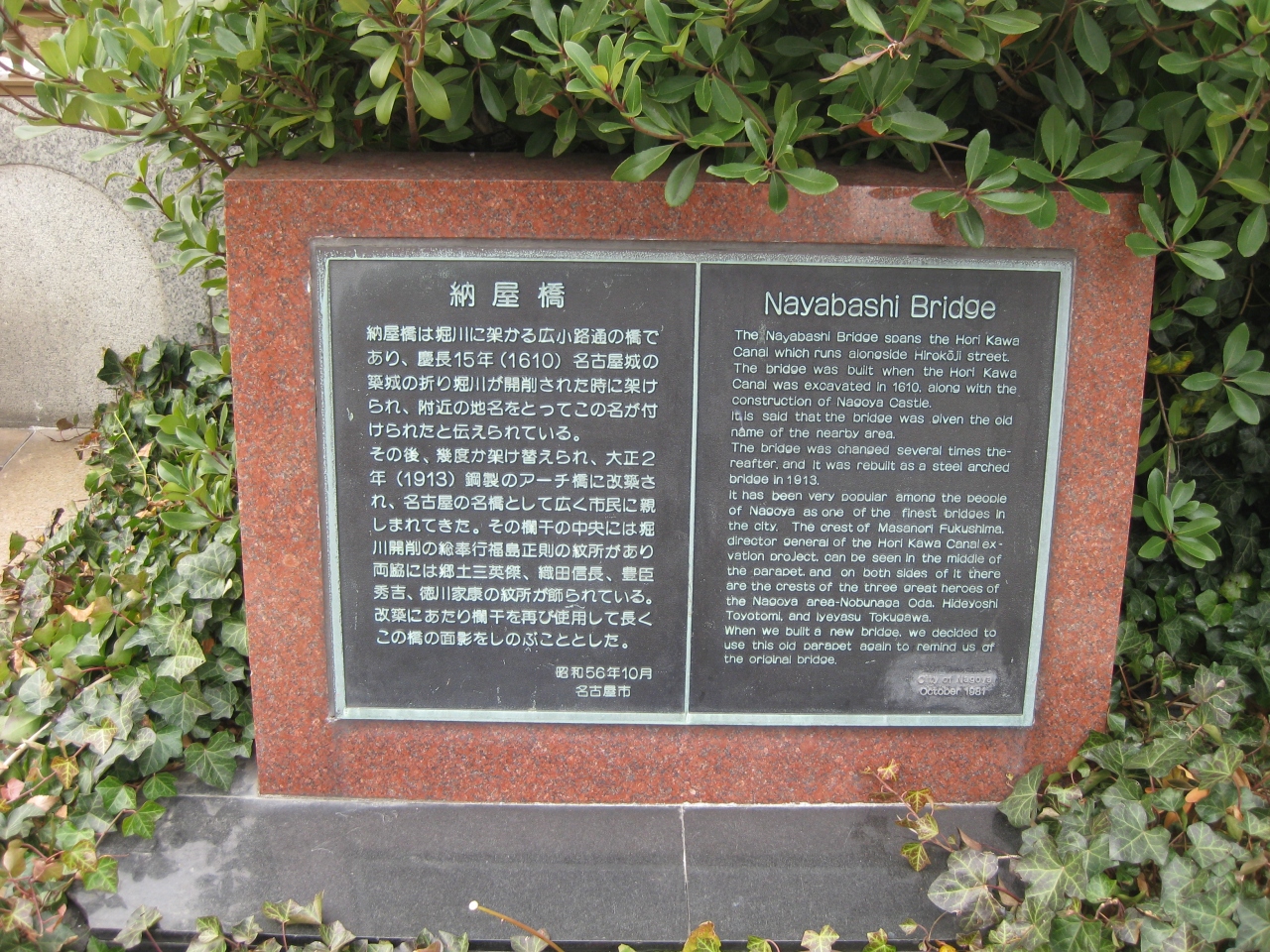 名古屋のメイン通り広小路道り堀川に架かる”堀川七橋”の一つ。名古屋駅と伏見駅の中間に位置し、慶長15年(1610年)堀川掘削の際に架けられた古い橋でその後何度も改築され現在の橋は昭和56年(1981年)に改築されたものです。中央部にテラスを持ち青銅鋳鉄の欄干が特徴の美しいアーチ型の橋です。名古屋観光巡りでは五条橋か納屋橋は由緒があり美しい姿ですから是非渡ってみて下さい。橋周辺は風俗街がまだ残っていますが。
