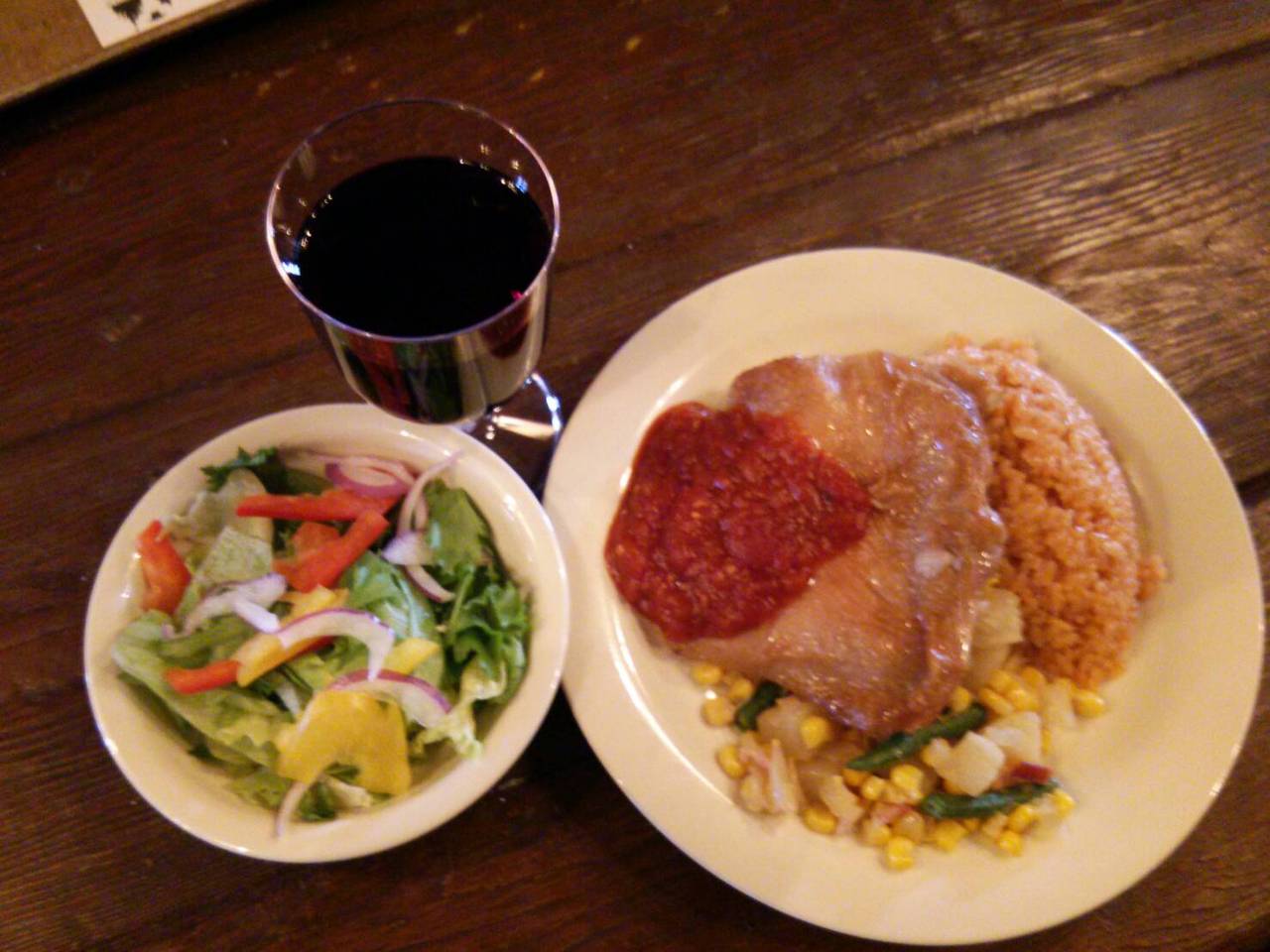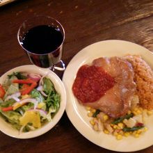 スモークチキンのセットを注文しました。セットにはサラダと好きなドリンクをつけれましたが、追加料金を支払いドリンクをアルコールに変更してもらいました。 メキシカンライスと付け合わせのベジタブルも美味しかったです。