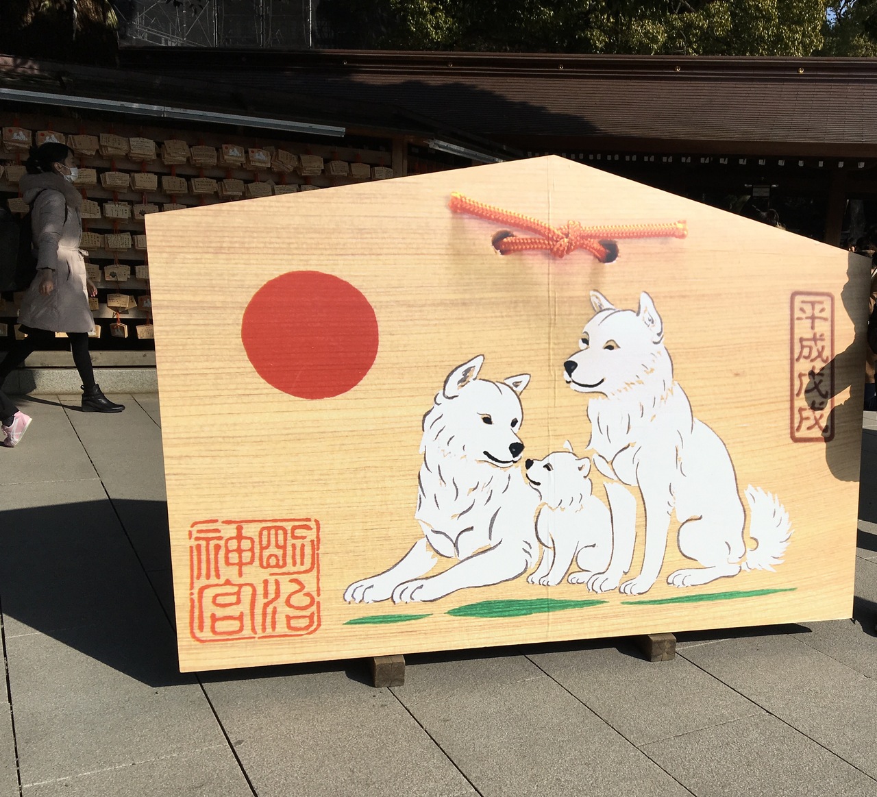 年明けに少し遅い初詣に行きました。まだお正月気分が残っているころでお休みの方もいる時期だったためとても混んでいました。境内には戌年にちなんで犬が描かれた大きな絵馬があり、みなさん絵馬と一緒に写真を撮っていました。