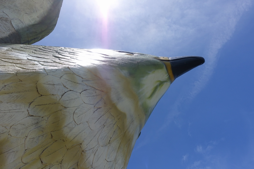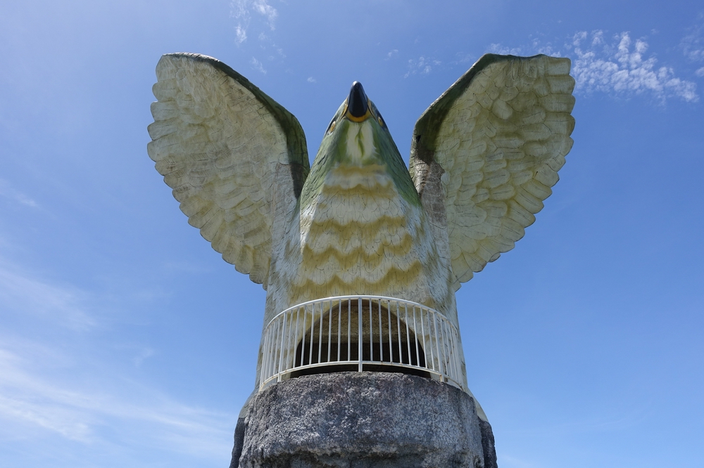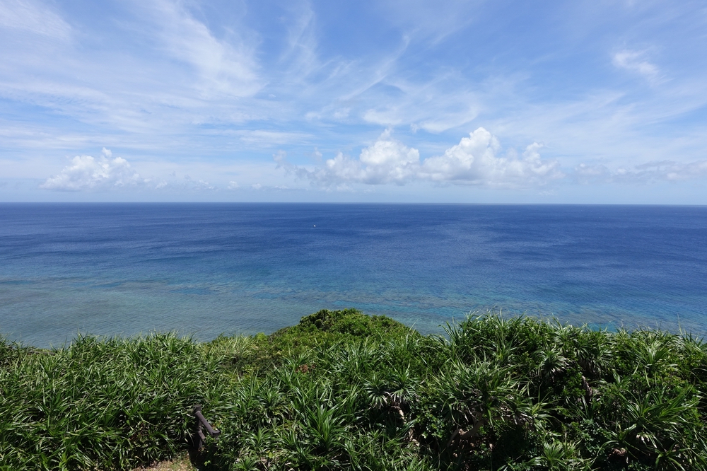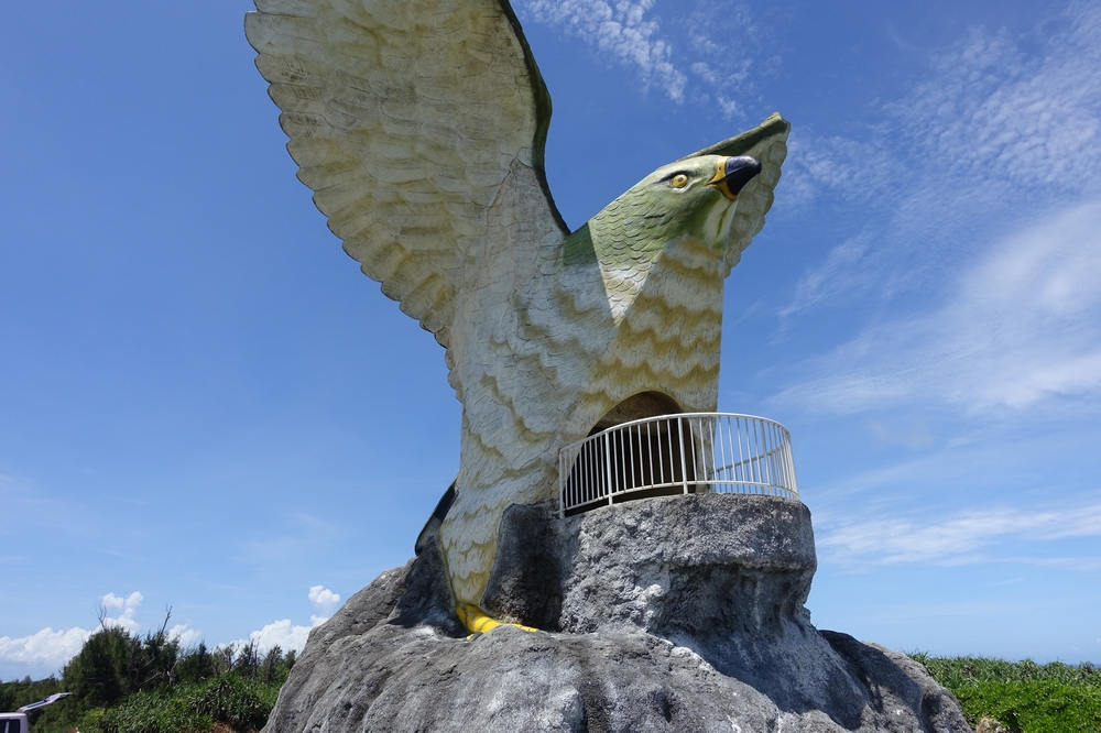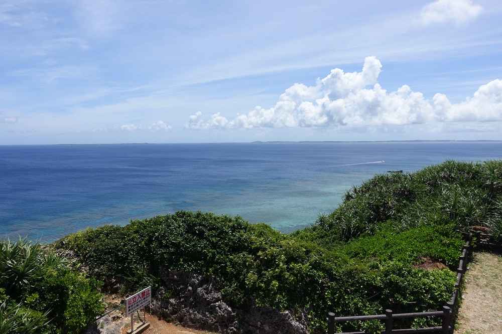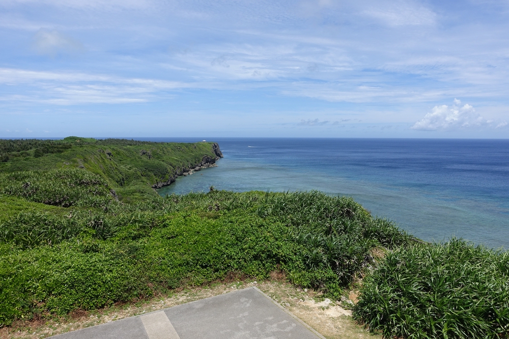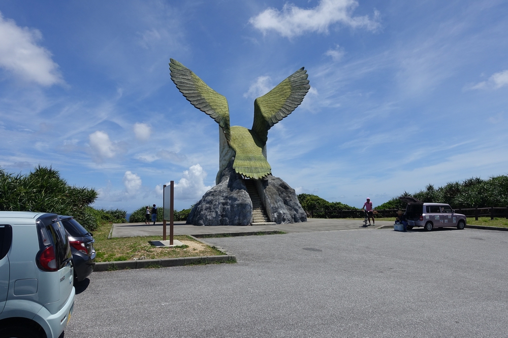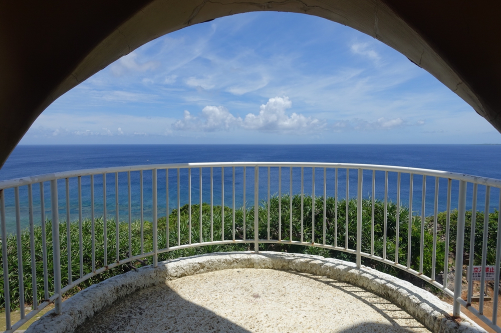 「船を見送る岬」という意味の展望スポット。サシバという渡り鳥が大きく翼を広げた姿の展望台で、見た目のインパクトから印象に残ります。北を向いているため、ほとんどが海の眺めとなりますが、海に向かって右手遠くに宮古島がうっすら見えました。