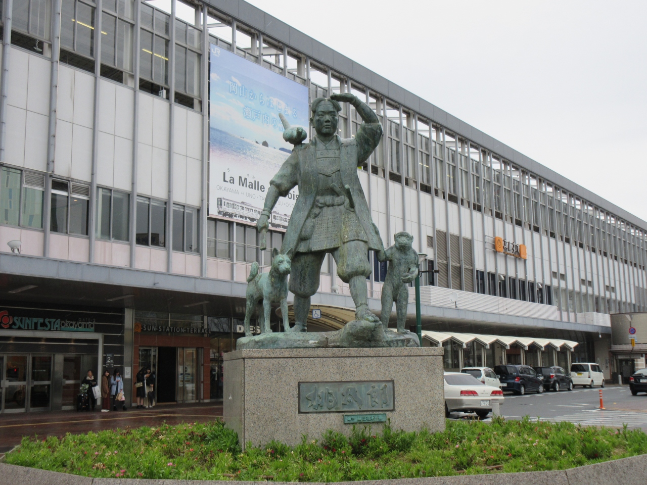 岡山駅東口駅前広場に建っています。肩にとまったキジと、犬、猿を引き連れた桃太郎が、岡山の街を見守っている像です。見方によっては、観光客を温かく歓迎している姿にも見えます。どちらにしろ、可愛らしい、岡山の玄関駅に建つにふさわしい像だと思います。像を中心に、その周囲には岡山県の歴史と未来を表現したモニュメントも造られています。ともに岡山に来たことが実感できる作品だと思います。