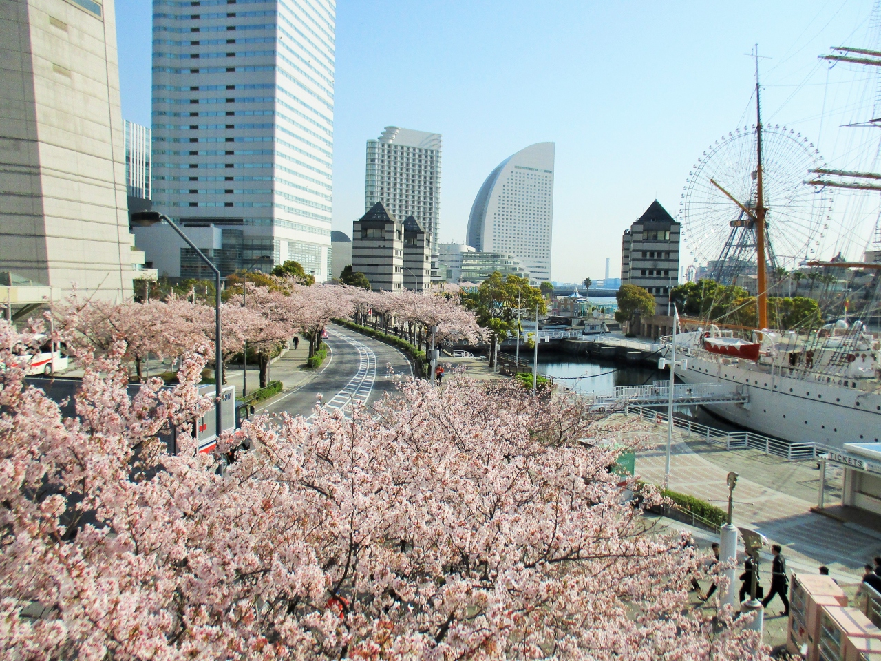 日本丸メモリアルパークの先にコスモワールドがあり、春には桜、その後にツツジがキレイに咲き、緩いカーブの先は、パシフィコ横浜、万葉倶楽部、カップヌードルミュージアムなどがあります。