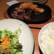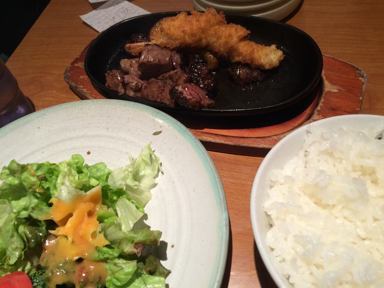 ステーキとエビフライのセットは、油跳ねがすごくてテーブルの上に置かれてあった伝票の文字が見えなくなるほど。
